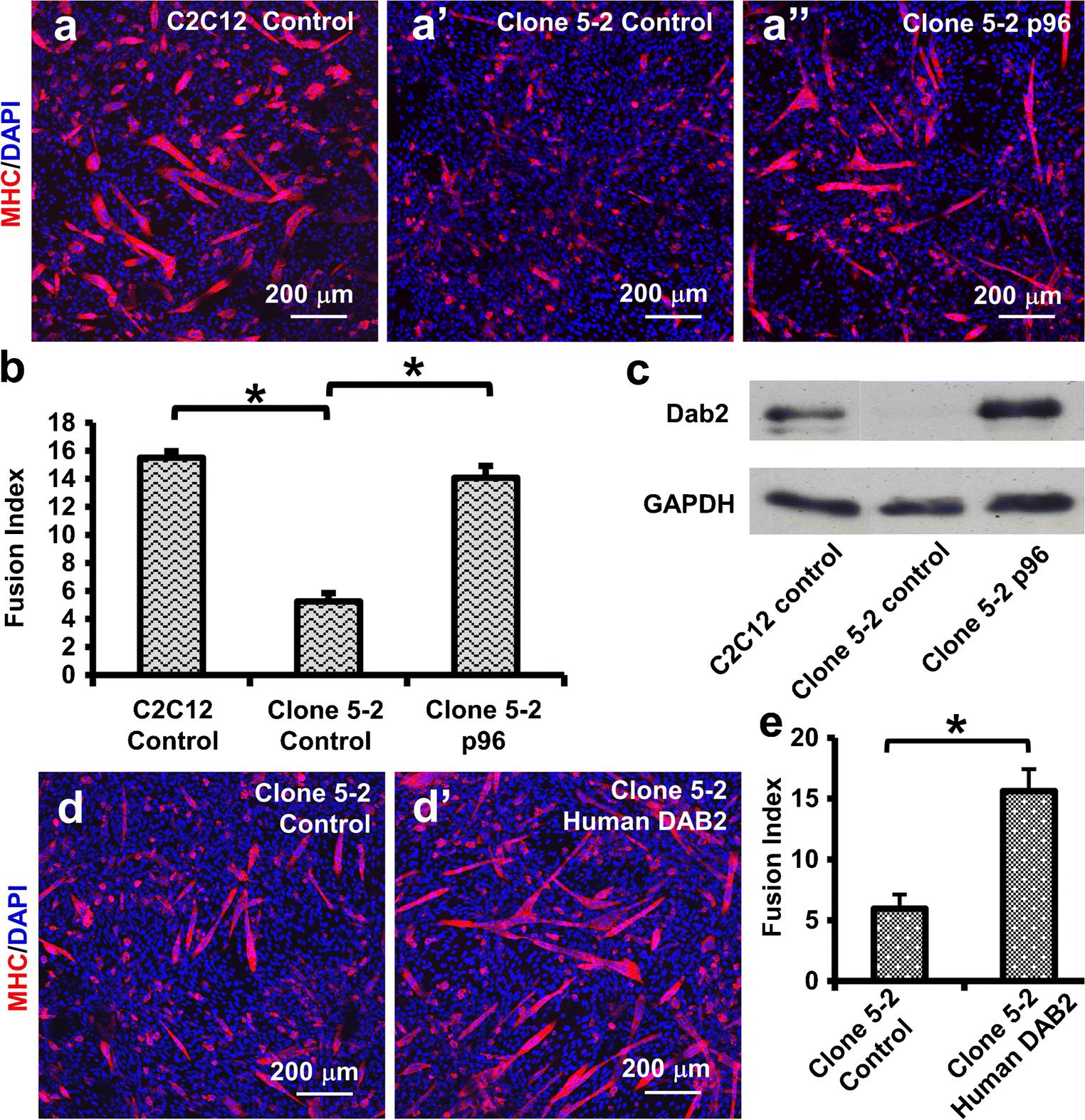 Fig. 5 Dab2 re-expression in clone 5-2 restored myogenic differentiation. Clone 5-2 cells were transfected with the control plasmid (EX-NEG-lv105) (Clone 5-2 Control) or the Dab2 (p96) expression plasmid (Clone 5-2 p96), whereas C2C12 cells transfected with the control plasmid (C2C12 Control) were used as the positive control for myogenic differentiation. On day 3 post-transfection, cells were cultured in the differentiation medium (2% NHS in DMEM) for 5 days to induce myotube formation. Cells were then immunofluorescently stained for MHC, and representative photomicrographs are shown in (a) and myogenic fusion indices shown in (b). (c) Western blot shows that on day 3 post-transfection, Dab2 expression in clone 5-2 transfected with p96 (Clone 5-2 p96) was restored to the level similar to that of C2C12 cells transfected with the control plasmid (C2C12 Control). (d, e) Clone 5-2 transfected with the human DAB2 expression plasmid also shows better myogenic differentiation than the clone 5-2 control transfected with the control vector. *pâ<â0.05, Studentâs t test, nâ=â4. Data are expressed as mean ± SD