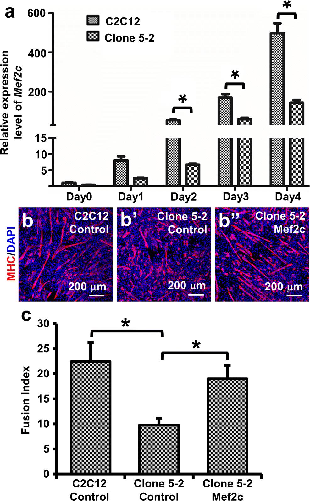 Fig. 7 Mef2c re-expression in clone 5-2 restored myoblast differentiation. (a) qPCR on the expression of Mef2c at different time points after clone 5-2 and C2C12 cells at 80% confluence were induced to differentiate with the differentiation medium containing 2% NHS on day 0. (b) Representative photomicrographs showing MHC immunoreactivities. Clone 5-2 cells were transfected with the control plasmid pCS2+ (Clone 5-2 Control) or the Mef2c expression plasmid (Clone 5-2 Mef2c), and C2C12 cells transfected with the control plasmid (C2C12 Control) serve as the positive control. On day 3 post-transfection, cells were induced to differentiate with the differentiation medium for 5 days, and then immunofluorescently stained for MHC. (c) Bar chart showing myogenic fusion indices 5 days after the induction of myotube formation. *pâ<â0.05, Studentâs t test, nâ=â4. Data are expressed as mean ± SD