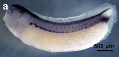 myod1 (myogenic differentiation 1) gene expression in a Xenopus laevis embryo, NF stage 31/32, assayed via in situ hybridization, lateral view, anterior left, dorsal up.