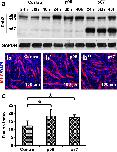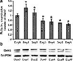 Fig. 1 Expression of Dab2 mRNAs and Dab2 proteins during C2C12 differentiation. C2C12 cells at 80% confluence were induced to differentiate with the differentiation medium containing 2% normal horse serum (NHS) on day 0, and harvested at different time points for (a) qPCR and (b) western blot. Anti-Dab2 antibodies are able to recognize all three isoforms. *pâ<â0.05 (nââ¥â3) significantly different from the value on day 0, one-way ANOVA followed by Turkeyâs test. Data are expressed as mean ± SD. Expression levels of Dab2 mRNA are normalized against the Gapdh level
