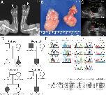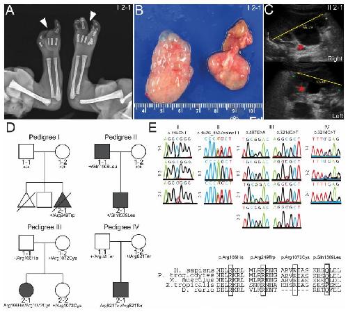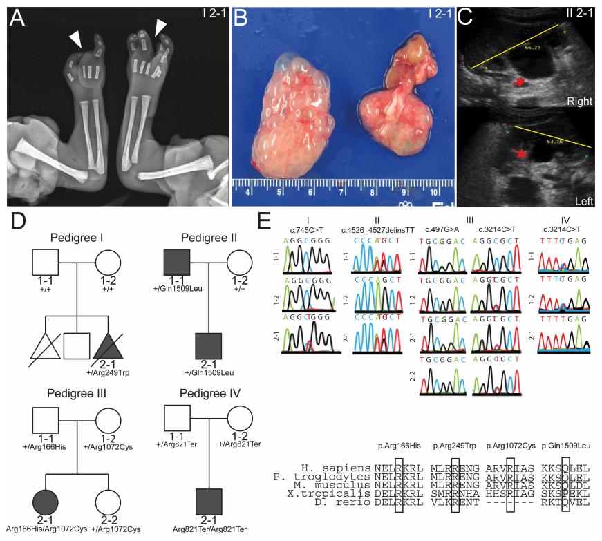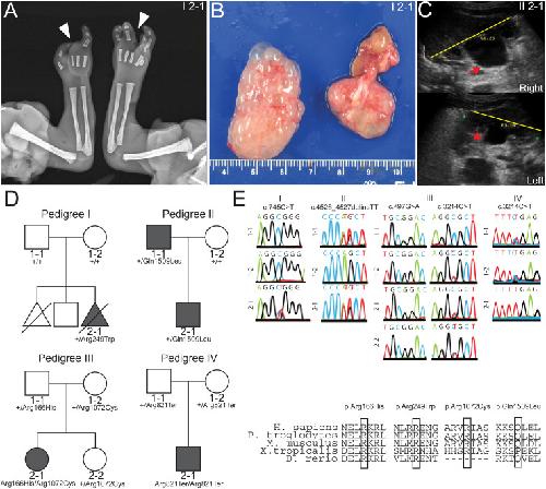Figure 1. Whole exome sequencing identifies discs large 5 (DLG5) variants in patients. (A) Radiograph of patient I 2â1 fetal upper extremities reveals bilateral ectrodactyly. (B) I 2â1 fetal kidneys were largely cystic and dysplastic. (C) Ultrasound of II 2â1 kidneys show hydronephrosis. Yellow line depicts span of kidney and red arrows indicate dilated renal pelvis. (D) Pedigrees depict families in which the DLG5 variants were identified. (E) Sanger sequencing confirming variant allele presence and amino conservation through phylogeny for the mutated allele of DLG5.