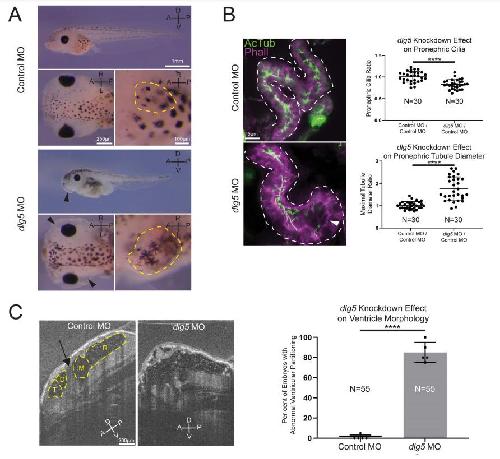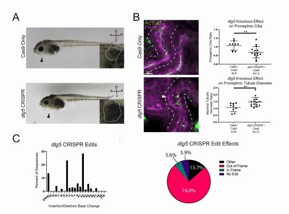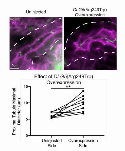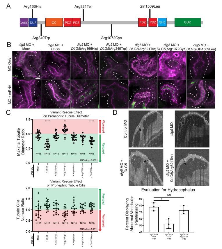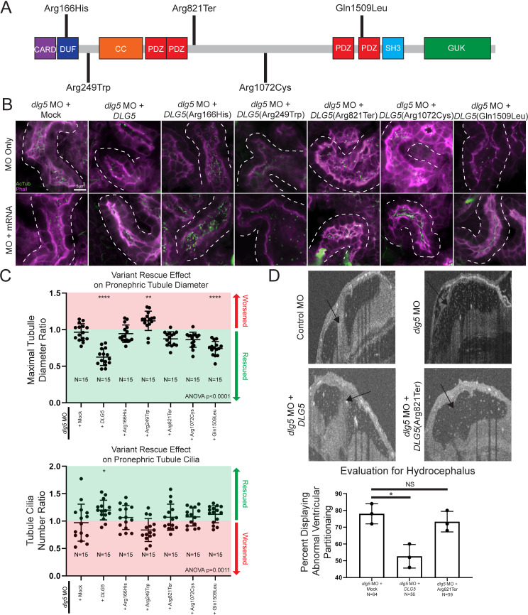 RESULTS: Patients with variants of DLG5 were found to have a variety of phenotypes including cystic kidneys, nephrotic syndrome, hydrocephalus, limb abnormalities, congenital heart disease and craniofacial malformations. We also observed a loss of cilia in cystic kidneytissue of our proband. Knockdown of dlg5 in Xenopus embryos recapitulated many of these phenotypes and resulted in a loss of cilia in multiple tissues. Unlike introduction of wildtype DLG5 in frog embryos depleted of dlg5, introduction of DLG5 patient variants was largely ineffective in restoring proper ciliation and tissue morphology in the kidney and brain suggesting that the variants were indeed detrimental to function.