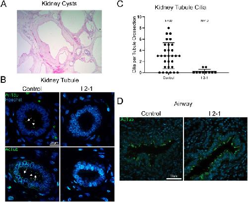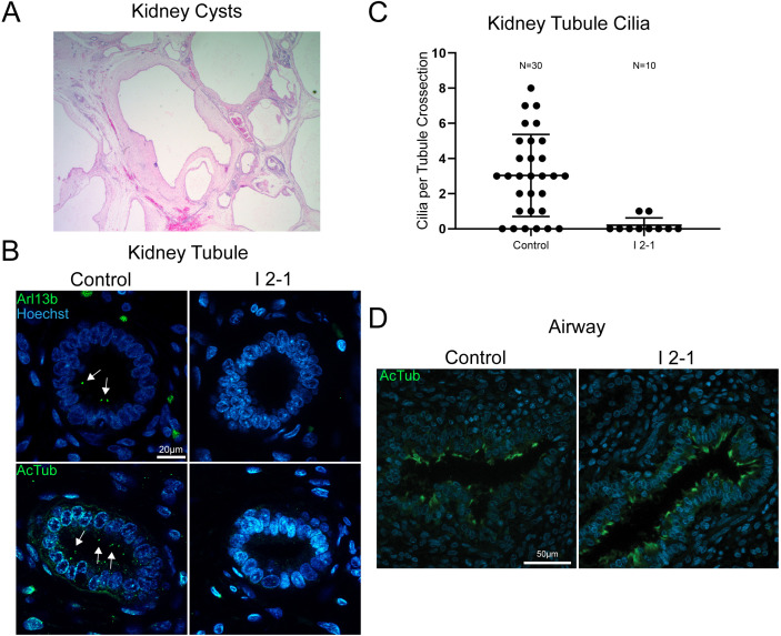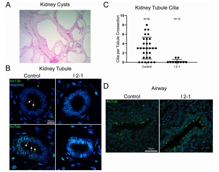 Figure 5. Proband tissue bearing discs large 5 (DLG5) variant c.745C>T (p.Arg249Trp) displays tissue-specific deficits in ciliation. (A) Representative H&E stain of I 2–1 kidney showing cystic morphology. (B) Control 23 weeks and I 2–1 weeks fetal kidney tissue cross-section immunofluorescence labelling of cilia Arl13b or acetylated tubulin show a loss of cilia in DLG5 variant tissue. (C) Quantitation of cilia number in each cross-sectional kidney tubule analysed. (D) Control 23 weeks and I 2–1 weeks fetal lung airway tissue cross-section immunofluorescence labelling of cilia acetylated tubulin shows intact airway ciliation in DLG5 variant tissue. Bars indicate mean and SD of individual counts.