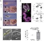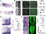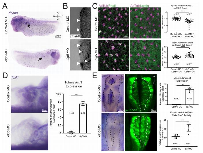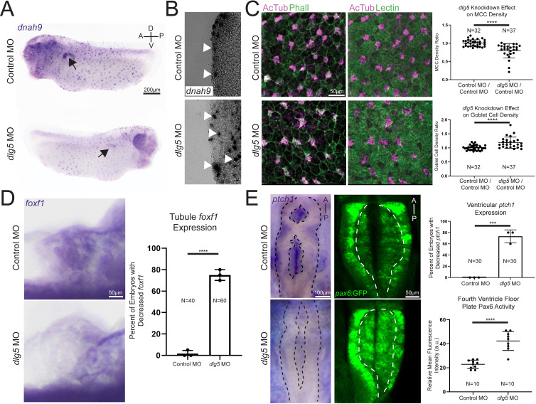 Figure 4. Knockdown of discs large 5 (dlg5) in Xenopus embryos causes cell polarity and Hedgehog signalling dysfunction. (A) Representative images of dnah9 in situ hybridisation in control MO and dlg5 MO sides of a stage 28 embryo depict fainter expression signal in the dlg5 depleted side. (B) Representative transverse sections of control MO and dlg5 MO sides of a stage 28 embryo reveal the more basal location of cells expressing the dnah9 marker of MCC cell fate. (C) Representative immunofluorescence images and quantitation of AcTub-positive ciliated cells/area and Lectin-positive goblet cells/area in control MO and dlg5 MO sides of a stage 28 embryo demonstrate the decreased density of MCCs and concomitant increased density of goblet cells in dlg5 depleted Xenopus epidermis. (D) Representative WISH for foxf1 Hedgehog target expression in control MO and dlg5 MO stage 45 pronephroi demonstrate the decreased Hedgehog signalling activity in dlg5 depleted pronephroi. (E) Representative expression and quantitation of ptch1 in control MO and dlg5 MO stage 45 brain ventricles as well as representative expression and quantitation of Pax6 in control MO and dlg5 MO stage 45 fourth ventricle demonstrate a decrease in ptch1 expression and expansion of Pax6. Black dotted line delineates bounds of the brain and white dotted line delineates bounds of fourth ventricle floor. A, anterior; D, dorsal; P, posterior; V, ventral. Statistical tests carried out as two-tailed t-tests for cell density (C) and Pax6 expression (E) and unpaired t-tests for foxf1 (D) and ptch1 (E) expression with ***p<0.005 and ****p<0.0001. Bars indicate mean and SD of individual values (E—Pax6 expression) or replicate means (D and E—foxf1 or ptch1 expression).