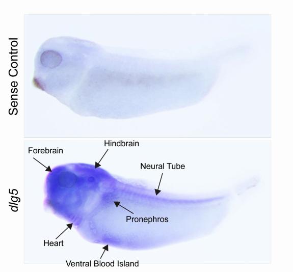 dlg5 (discs large homolog 5) gene expression in Xenopus tropicalis embryo, assayed via in situ hybridization, NF stage 36, lateral view, anteriorleft, dorsal up.