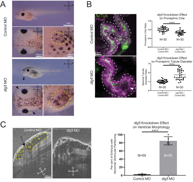 Figure 2. Knockdown of discs large 5 (dlg5) in Xenopus embryos causes kidney and brain ventricle dysmorphology. (A) Representative images of stage 45 embryos injected with either a standard control MO or dlg5 MO show oedema (black arrow head) and kidney dysplasia (outlined in yellow) resulting from dlg5 knockdown. (B) Representative images of control MO and dlg5 MO-injected sides of stage 45 embryos along with quantitation reveal a loss of cilia and increased proximal tubule diameter in the pronephroi. Each data point is the ratio within a single embryo of either cilia detected or maximal tubule diameter in the proximal tubule between two sides either both treated with control MO (Control MO/Control MO) or one treated with dlg5 MO and the other treated with control MO (dlg5 MO/Control MO). (C) Representative images and quantitation of stage 45 embryos injected with either a standard control MO or dlg5 MO imaged via optical coherence tomography demonstrate the ventricular dysmorphology that results from dlg5 knockdown. The arrow designates the typical division between ventricles that can be found lateral to the brain midline. Embryonic axes are labelled for reference. A, anterior; D, dorsal; P, posterior; V, ventral; L, left; R, right. Ventricles are labelled according to the adjacent subdivisions of the embryonic brain. T, telencephalon; D, diencephalon; M, mesencephalon; R, rhombencephalon. Statistical tests carried out as two-tailed t-tests with ****p<0.0001 (A) or an unpaired t-test with ****p<0.0001 (C). Bars indicate mean and SD of individual values (B) or replicate means (C).