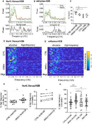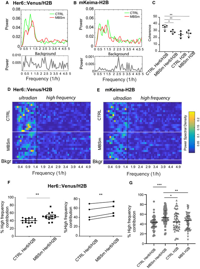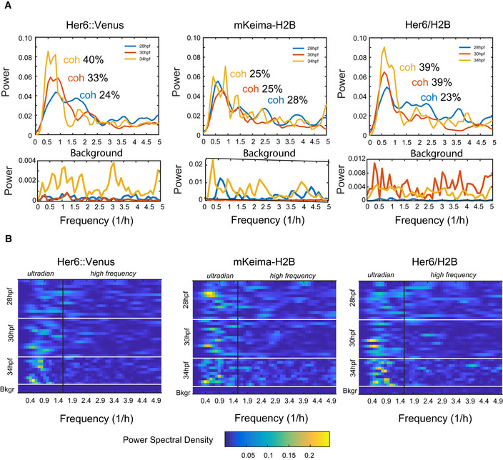 Figure EV4. Frequency analysis of Her6::Venus observed in progenitors in the presence and absence of miR‐9 regulation. Related to Fig 4