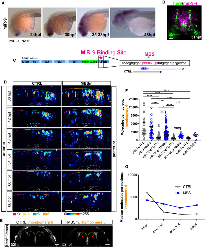Figure 3. A mutation of the miR‐9 binding site affects Her6 level over the course of development