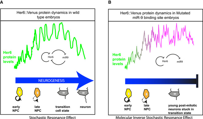 Dynamic properties of noise and Her6 levels are optimized by miR-9, allowing the decoding of the Her6 oscillator.