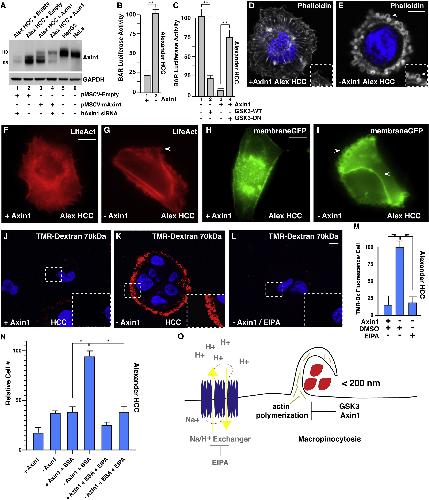 Figure 1 Axin1 Mutation Causes Increased Macropinocytosis in Alexander HCC Cells, as Revealed by Axin Reconstitution. (A) Axin1 protein expression levels assessed after transduction with pMSCV-empty vector (lanes 1 and 2), pMSCV mouse Axin1 in Alexander hepatocellular carcinoma (HCC) cells (lanes 3 and 4), or in HepG2 and HeLa cells (lanes 5 and 6). Alexander cells express an endogenous form of Axin1 that is shorter than the full-length protein (110 kDa) due to the deletion of exon 4 (95 kDa), which is the region that interacts with GSK3 (Satoh et. al., 2000). To show that the lower band was indeed Axin1, cells were transfected with human siRNA that spares mouse Axin1 mRNA (lanes 1 and 4). Note that the expression levels of reconstituted Axin1 were lower than those of the smaller protein skipping exon 4 in Alexander cells or those of endogenous full-length Axin1 in HepG2 or HeLa cells, indicating that Axin1 levels were within the physiological range. (B) Axin1 mutant cells showed increased β-catenin activity reporter (BAR- Luciferase, relative to Renilla), in Alexander cells, when compared to Axin1 reconstituted cells. (C) Wild-type (WT) GSK3-GFP transfection in Axin1-mutated HCC cells decreased BAR-Luciferase activity relative to Renilla in Alexander minus Axin1 cells, while dominant-negative GSK3 (GSK3-DN) expression was sufficient to increase BAR- Luciferase activity in Axin1-reconstituted cells. (D) Axin1-reconstituted HCC cells displayed actin stress fibers visualized by phalloidin F-actin staining. (E) Axin1-mutated HCC cells had extensive cortical actin remodeling with large vesicular structures (arrowhead), visualized by phalloidin. (F) LifeAct F-actin imaging showing actin stress fibers in Axin1-reconstituted HCC cells (see also Movie S1). (G) Axin1-mutant HCC cells showed macropinosome-like structures by LifeAct F-actin imaging (see also Movie S1). (H) MembraneGFP transfected Axin1-reconstituted Alexander HCC cells. (I) Axin1-mutated HCC cells led to dynamic membrane remodeling (arrowhead) and vesicle formation in the apical plasma membrane while not between neighboring cells (arrow) visualized by membraneGFP. H and I represent still images from Movie S2. (J) Axin1-reconstituted HCC cells do not increase uptake of TMR-dextran (dx) 70 kDa. (K) Axin1 mutated cells have high levels of TMR-dx marking macropinocytosis. Inset shows higher magnifications to reveal macropinosomes. (L) TMR-dx uptake is sensitive EIPA treatment in Axin1-mutated cells. (M) Quantification of increased TMR-dx uptake in Axin1-mutated cells compared to Axin1-reconstituted cells or with treatment with EIPA. See also Figure S1. Error bars denote SEM (n ⥠3), (âp > 0.05, ââp > 0.01) in biological replicates. Scale bars, 10 μm. (N) Mutation of Axin1 allowed growth of HCC cells in the absence of serum and Glutamine at the expense of 3% BSA in an EIPA-dependent manner (brackets). Alexander HCC cells ±Axin1 were grown in serum-starved medium for three days and the increase in numbers of viable cells counted by trypan blue exclusion assay. The results are consistent with the view that mutation of Axin1 increases cell nutrition through macropinocytosis. (O) Model showing that macropinocytosis incorporation of extracellular macromolecules is repressed in basal cell conditions by a complex of Axin1 and GSK3, the loss of either one results in actin remodeling and massive macropinocytosis of macromolecules (red) in a process that relies on Na+/H+ exchangers which are the target of the macropinocytosis inhibitor EIPA. |