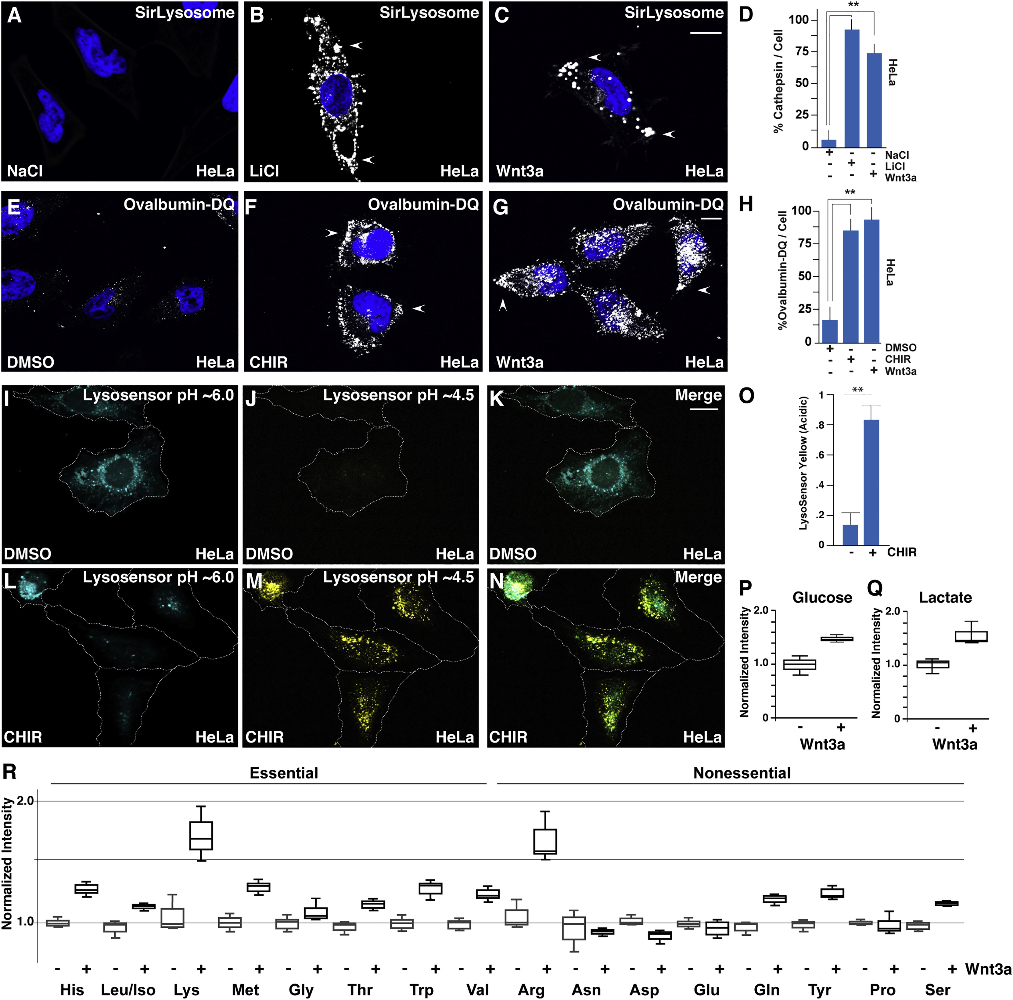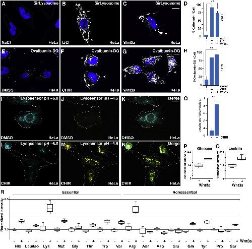 Figure 4. GSK3 Inhibition or Wnt Treatment Cause Increased Lysosomal Activity, Lysosomal Acidification, and Metabolite Changes(A) Active lysosomal cathepsin D detected by the cell-permeable SiRLysosome fluorogenic probe in HeLa cells.(B) SiRLysosome was increased by LiCl treatment after 20 min.(C) SiRLysosome was increased by Wnt3a protein treatment after 20 min.(D) Quantification of cathepsin D activity by SiRLysosome fluorescence with LiCl, Wnt3a, or control treatments.(E) Uptake and lysosomal degradation of extracellular ovalbumin-DQ in DMSO treated HeLa cells.(F) Ovalbumin-DQ uptake and degradation was increased by CHIR in HeLa cells.(G) Ovalbumin-DQ uptake and degradation was increased following Wnt3a treatment.(H) Quantification of ovalbumin-DQ degradation in lysosomes with CHIR or Wnt3a treatment.(I) Lysosomal pH quantitation using the ratiometric LysoSensor reagent in HeLa cells treated with DMSO. Blue fluorescence indicated pH ~6.0 of pre-existing lysosomes.(J) LysoSensor pH staining in the yellow channel (pH ~4.5) in DMSO control cells.(K) LysoSensor staining in control DMSO treated cells with yellow and blue channels merged.(L) LysoSensor staining in the blue channel was decreased after the addition of CHIR.(M) LysoSensor staining in the yellow channel (pH ~4.5) was increased by CHIR.(N) LysoSensor blue and yellow channels in CHIR treated cells indicating that GSK3 inhibition induces lysosomal acidification, which can be visualized as a shift from blue to yellow.(O) Quantification of LysoSensor pH ratiometric staining in DMSO or CHIR treated cells.(P) Intracellular glucose following the addition of Wnt3a treatment to HeLa cells for 60 min compared to vehicle control in medium containing U-13C-glucose.(Q) Intracellular lactate following Wnt3a addition to HeLa cells for 60 min compared to vehicle control in medium containing U-13C-glucose.(R) Intracellular amino acid pool sizes following Wnt3a addition to HeLa cells for 60 min compared to vehicle control in medium containing U-13C-glucose. Experiments represent biological replicates. Error bars denote SEM (n ⥠3) (**p > 0.01). Scale bars, 10 μm. See also Figure S3. |