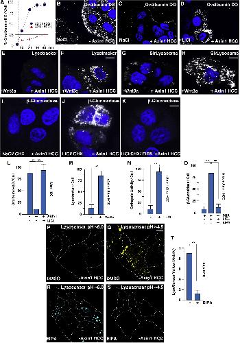 Figure 5 Axin Reconstitution in HCC Alexander Cells Represses Macropinocytosis, and Reconstituted Cells Respond to GSK3 Inhibitors or Wnt3a by Increasing Lysosomal Catabolism in a Manner Dependent on Na+/H+ Exchanger Activity. (A) Axin1 mutated HCC cells rapidly degraded ovalbumin-DQ added to the culture medium, compared to Axin1 reconstituted HCC cells. (B) Axin1 mutated HCC cells treated with NaCl and stained with ovalbumin-DQ. (C) Axin1 reconstituted HCC cells treated with NaCl and stained with ovalbumin-DQ. (D) Axin1 reconstituted HCC cells treated with LiCl (20 min) and stained with ovalbumin-DQ. (E) Axin1 reconstituted HCC cells stained with Lysotracker in control treatments. (F) Axin1 reconstituted HCC cells respond to Wnt3a treatment by increasing Lysotracker. (G) Axin1 reconstituted HCC cells stained with SirLysosome marking active cathepsin D in control cells. (H) Wnt3a increased active cathepsin D marked by SirLysosome in Axin1 reconstituted HCC cells. (I) Axin1 reconstituted HCC cells treated with CHX and stained with a substrate of β-glucosidase, which marks enzymatic cleavage activity of lysosomes. (J) Axin1 reconstituted HCC cells treated with CHX and LiCl and stained with β-glucosidase substrate. LiCl induced lysosomal activity via macropinocytosis independent of protein synthesis. (K) EIPA treatment in Axin1 reconstituted HCC cells blocked LiCl-induced enzymatic cleavage of the β-glucosidase substrate. (LâO) Quantification of lysosomal fluorescent tracers ovalbumin-DQ (L), lysotracker (M), cathepsin D (N), and β-glucosidase (O). (P) Lysosomal pH changes measured with the ratiometric cell-permeable LysoSensor reagent in Axin1-mutated HCC cells treated with DMSO in the blue channel (pH â¼6.0). (Q) LysoSensor staining in Axin1-mutated HCC cells treated with DMSO in the yellow channel (pH â¼4.5) indicating high lysosomal acidity. (R) LysoSensor staining in Axin1-mutated HCC cells treated with EIPA in the blue channel (pH â¼6.0). (S) LysoSensor staining in Axin1-mutated HCC cells in the yellow channel (pH â¼4.5) showing that EIPA decreased lysosomal acidity. (T) Quantification of lysosomal pH changes measured with LysoSensor indicated that acidic lysosomes of pH â¼4.5 were rapidly reduced following the addition of EIPA, visualized as a shift from yellow to blue (compare Q to R). Experiments represent biological replicates. Error bars denote SEM (n ⥠3) (ââp > 0.01). Scale bars, 10 μm. See also Figure S4 and S5. |