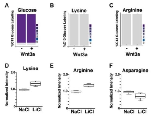 Figure S3. Metabolomics of U-13C-Glucose Labeling after Wnt3a Treatment; Changes in Amino Acid Pools after GSK3 Inhibition Mimic the Effects of Wnt3a; Related to Figure 4 (A) Glucose incorporation is uniformly labeled by U-13C-glucose (purple) after Wnt3a treatment in HeLa cells. (B, C) Amino acids increased by Wnt3a such as Lysine and Arginine do not derive from increased glucose levels. These labeled glucose incorporation experiments correspond to the same metabolomic samples shown in Figure 4P and R of the main text. (D-F) LiCl treatment (40 mM) for 1 hour, but not NaCl control, leads to amino acid changes in HeLa cells that resemble those induced by Wnt3a protein. Note that Lysine and Arginine are elevated while Asparagine is decreased, as in Figure 4R. Experiments represent biological triplicates (n=3). Error bars denote SEM. |