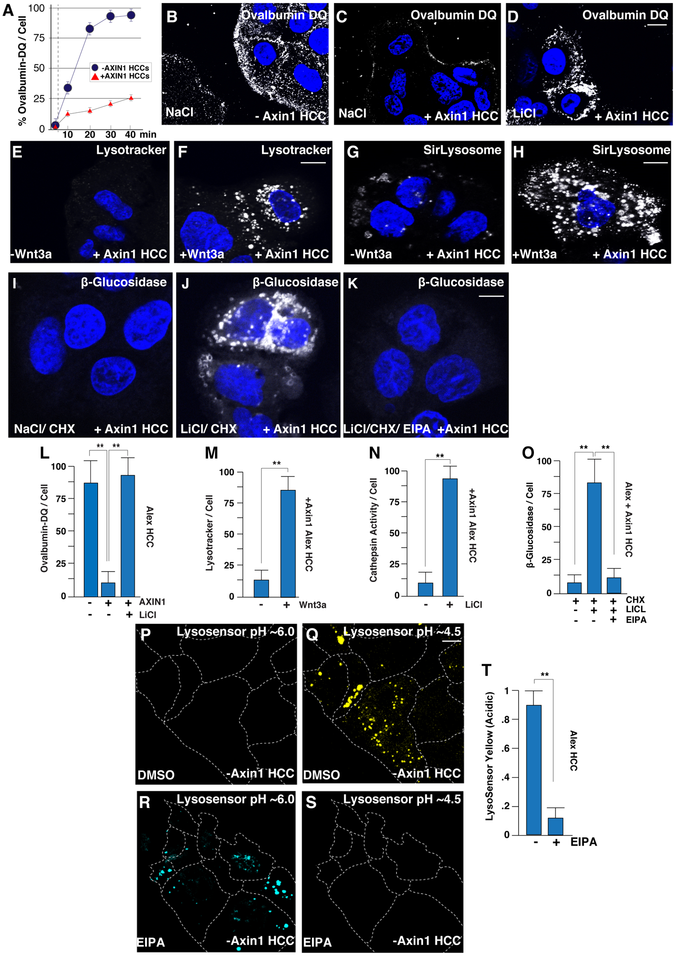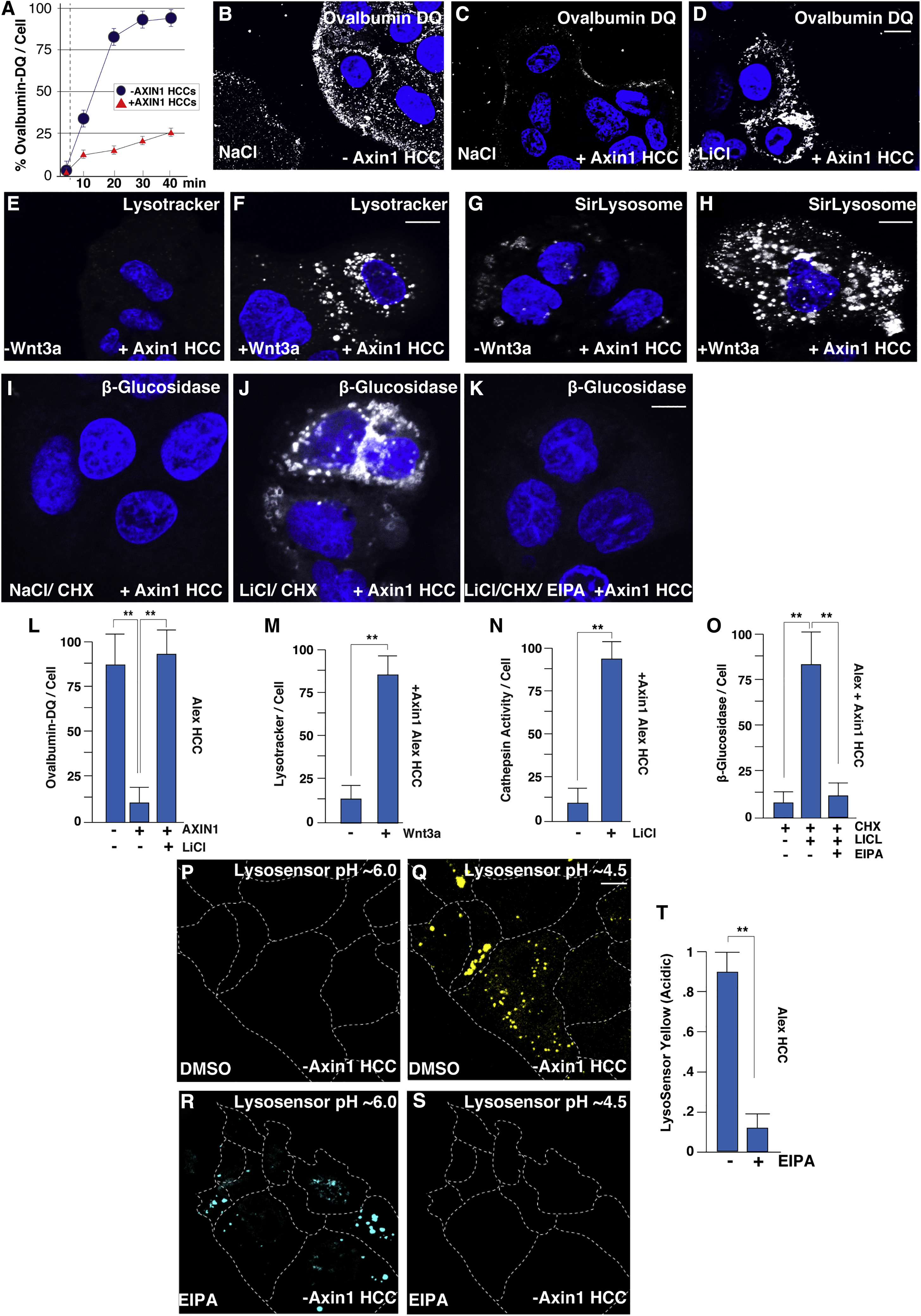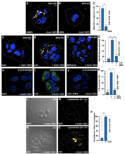 Figure 5. Axin Reconstitution in HCC Alexander Cells Represses Macropinocytosis, and Reconstituted Cells Respond to GSK3 Inhibitors or Wnt3a by Increasing Lysosomal Catabolism in a Manner Dependent on Na+/H+ Exchanger Activity(A) Axin1 mutated HCC cells rapidly degraded ovalbumin-DQ added to the culture medium, compared to Axin1 reconstituted HCC cells.(B) Axin1 mutated HCC cells treated with NaCl and stained with ovalbumin-DQ.(C) Axin1 reconstituted HCC cells treated with NaCl and stained with ovalbumin-DQ.(D) Axin1 reconstituted HCC cells treated with LiCl (20 min) and stained with ovalbumin-DQ.(E) Axin1 reconstituted HCC cells stained with Lysotracker in control treatments.(F) Axin1 reconstituted HCC cells respond to Wnt3a treatment by increasing Lysotracker.(G) Axin1 reconstituted HCC cells stained with SirLysosome marking active cathepsin D in control cells.(H) Wnt3a increased active cathepsin D marked by SirLysosome in Axin1 reconstituted HCC cells.(I) Axin1 reconstituted HCC cells treated with CHX and stained with a substrate of β-glucosidase, which marks enzymatic cleavage activity of lysosomes.(J) Axin1 reconstituted HCC cells treated with CHX and LiCl and stained with β-glucosidase substrate. LiCl induced lysosomal activity via macropinocytosis independent of protein synthesis.(K) EIPA treatment in Axin1 reconstituted HCC cells blocked LiCl-induced enzymatic cleavage of the β-glucosidase substrate. (LâO) Quantification of lysosomal fluorescent tracers ovalbumin-DQ (L), lysotracker (M), cathepsin D (N), and β-glucosidase (O).(P) Lysosomal pH changes measured with the ratiometric cell-permeable LysoSensor reagent in Axin1-mutated HCC cells treated with DMSO in the blue channel (pH ~6.0).(Q) LysoSensor staining in Axin1-mutated HCC cells treated with DMSO in the yellow channel (pH ~4.5) indicating high lysosomal acidity.(R) LysoSensor staining in Axin1-mutated HCC cells treated with EIPA in the blue channel (pH ~6.0).(S) LysoSensor staining in Axin1-mutated HCC cells in the yellow channel (pH ~4.5) showing that EIPA decreased lysosomal acidity.(T) Quantification of lysosomal pH changes measured with LysoSensor indicated that acidic lysosomes of pH ~4.5 were rapidly reduced following the addition of EIPA, visualized as a shift from yellow to blue (compare Q to R). Experiments represent biological replicates. Error bars denote SEM (n ⥠3) (**p > 0.01). Scale bars, 10 μm. See also Figure S4 and S5. |