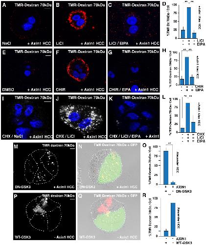 Figure 2. GSK3 Inhibition Increases Macropinocytosis Even in the Absence of Protein Synthesis(A) Axin1-reconstituted HCC cells treated with NaCl and stained with TMR-dx 70 kDa.(B) Axin1-reconstituted HCC cells treated with GSK3 inhibitor, LiCl, increased TMR-dx uptake after 20 min.(C) Axin1-reconstituted HCC cells treated with EIPA decreased TMR-dx uptake by LiCl.(D) Quantification of LiCl induced TMR-dx uptake in Axin1-reconstituted HCC cells.(E) Axin1-reconstituted HCC cells treated with DMSO and stained with TMR-dx.(F) Axin1-reconstituted HCC cells treated with GSK3 inhibitor, CHIR, increased TMR uptake after 20 min.(G) Axin1-reconstituted HCC cells treated with EIPA decreased TMR-dx uptake by CHIR.(H) Quantification of CHIR induced TMR-dx uptake in Axin1-reconstituted HCC cells.(I) Axin1-reconstituted HCC cells treated NaCl stained with TMR-dx in the absence of new protein synthesis blocked by cycloheximide (20 mg/ml CHX).(J) Axin1-reconstituted HCC cells treated with LiCl and stained with TMR-dx treated with CHX (4 h).(K) Axin1-reconstituted HCC cells treated LiCl, CHX, and EIPA stained with TMR-dx.(L) Quantification of LiCl induced TMR-dx uptake in Axin1-reconstituted HCC cells in the presence of CHX.(M) Dominant-negative GSK3-GFP (DN-GSK3-GFP) induced macropinocytic TMR-dx uptake in Axin1 transfected HCC cells, compared to nontransfected neighboring cells.(N) DN-GSK3-GFP expression with TMR-dx uptake and DIC phase contrast in Axin1 transfected HCC cells.(O) Quantification of DN-GSK3-GFP-induced macropinocytic TMR-dx uptake in Axin1 transfected HCC cells, compared to nontransfected neighboring cells.(P) Wild-type (WT) GSK3-GFP inhibited TMR-dx uptake in transfected minus Axin1 HCC cells, compared to nontransfected neighboring cells.(Q) WT-GSK3-GFP expression with TMR-dx uptake and DIC phase contrast in Axin1transfected HCC cells.(R) Quantification of TMR-dx uptake in Axin1 transfected WT-GSK3-GFP HCC cells, compared to nontransfected neighboring cells. Experiments represent biological replicates. Error bars denote SEM (n ⥠3) (**p > 0.01). Scale bars, 10 μm. See also Figure S2. |