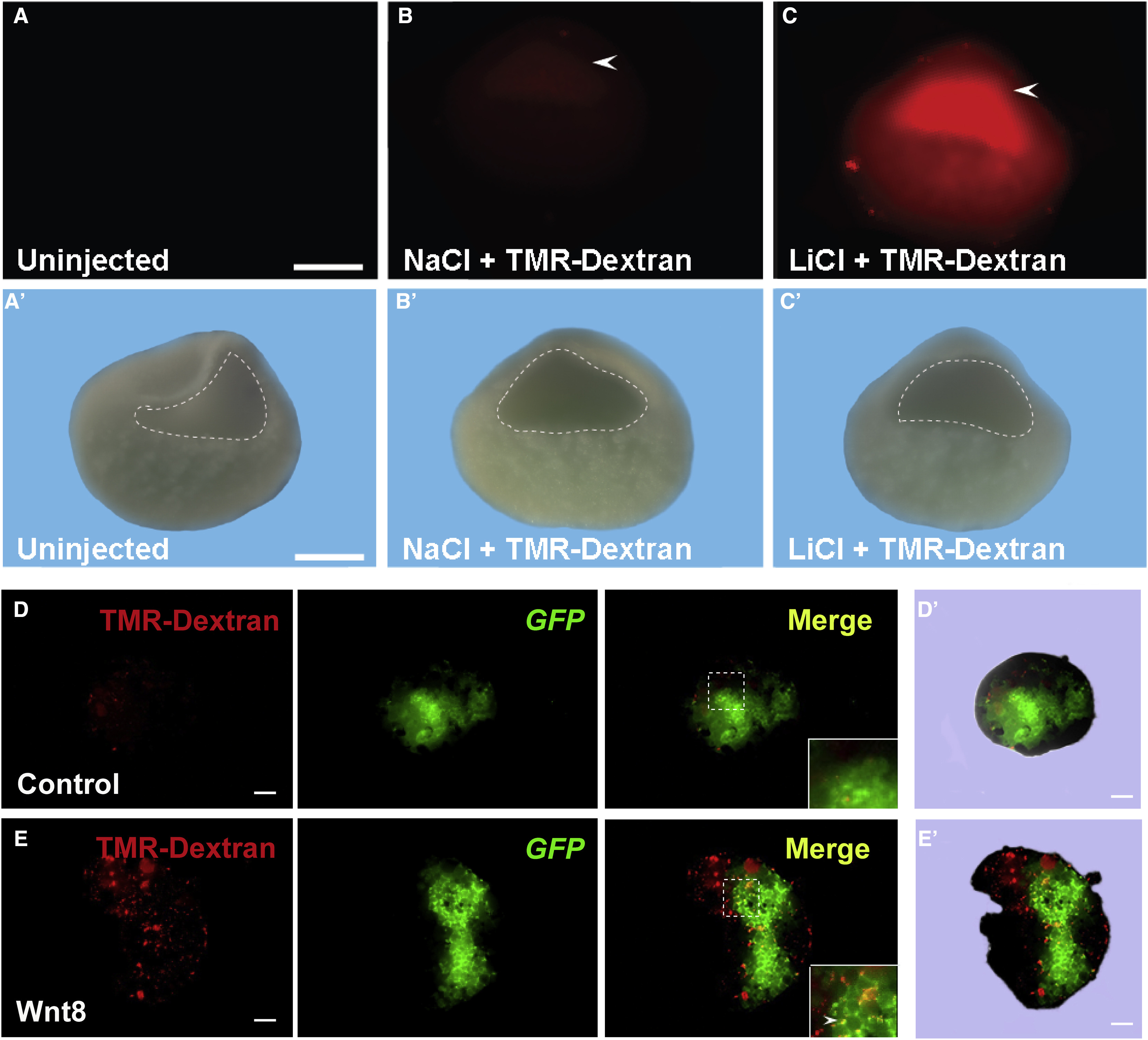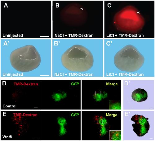 Figure 3. In Vivo Inhibition of GSK3 by LiCl Microinjection Causes Increased Macropinocytosis in the Blastula Cavity(A) Uninjected Xenopus embryos had no detectable fluorescence at blastula (n = 44).(Aâ²) Blastocoel in uninjected embryos delineated in the visible light image.(B) Controls injected with NaCl did not activate macropinocytosis (n = 127; 27% of half-embryos had small fluorescent spots of damaged cells but lacked uniform staining). Embryos were injected at midblastula and cultured for one hour before fixation and bisection.(Bâ²) Blastocoel in NaCl injected embryos delineated in the visible light image.(C) LiCl microinjection at midblastula stage increased TMR-dx 70 kDa uptake in blastocoel-lining cells in Xenopus embryos (n = 111 half-embryos, 78% with uniformly increased macropinocytosis in the blastocoel, 2 independent experiments).(Câ²) Blastocoel in LiCl injected embryos delineated in the visible light image. Scale bar, 0.35 mm.(D) Ectodermal explant from a control embryo microinjected into one blastomere with 300 pg mGFP mRNA at the four-cell stage, cultured until late blastula (stage 8.5), and incubated with 1 mg/mL of TMR-dx for 1hr in Steinbergâs solution (n = 13). Note the lack of macropinocytic puncta.(Dâ²) Contour of the ectodermal explant in control embryo in visible light.(E) Ectodermal explant co- injected with 10 pg of xWnt8 and mGFP mRNAs and incubated for 1 h with TMR-dx. Note that xWnt8 mRNA stimulates macropinocytosis of TMR-dx in distinct puncta in cells injected with mRNA and in the immediate surrounding cells (n = 20).(Eâ²) Contour of the ectodermal explant in xWnt8 injected embryo in visible light. Scale bars, 10 μm. |