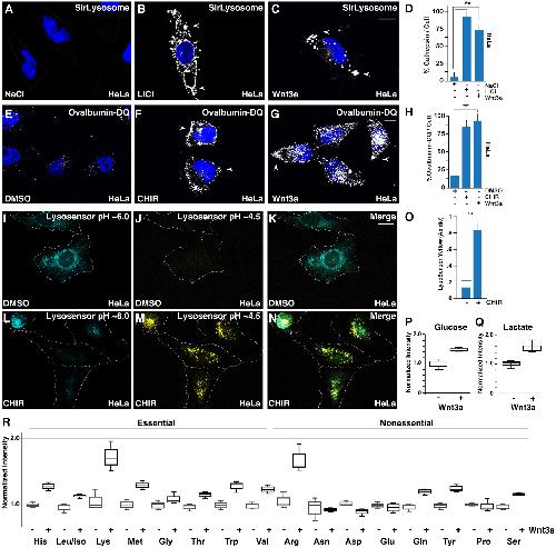 Figure 4 GSK3 Inhibition or Wnt Treatment Cause Increased Lysosomal Activity, Lysosomal Acidification, and Metabolite Changes (A) Active lysosomal cathepsin D detected by the cell-permeable SiRLysosome fluorogenic probe in HeLa cells. (B) SiRLysosome was increased by LiCl treatment after 20 min. (C) SiRLysosome was increased by Wnt3a protein treatment after 20 min. (D) Quantification of cathepsin D activity by SiRLysosome fluorescence with LiCl, Wnt3a, or control treatments. (E) Uptake and lysosomal degradation of extracellular ovalbumin-DQ in DMSO treated HeLa cells. (F) Ovalbumin-DQ uptake and degradation was increased by CHIR in HeLa cells. (G) Ovalbumin-DQ uptake and degradation was increased following Wnt3a treatment. (H) Quantification of ovalbumin-DQ degradation in lysosomes with CHIR or Wnt3a treatment. (I) Lysosomal pH quantitation using the ratiometric LysoSensor reagent in HeLa cells treated with DMSO. Blue fluorescence indicated pH â¼6.0 of pre-existing lysosomes. (J) LysoSensor pH staining in the yellow channel (pH â¼4.5) in DMSO control cells. (K) LysoSensor staining in control DMSO treated cells with yellow and blue channels merged. (L) LysoSensor staining in the blue channel was decreased after the addition of CHIR. (M) LysoSensor staining in the yellow channel (pH â¼4.5) was increased by CHIR. (N) LysoSensor blue and yellow channels in CHIR treated cells indicating that GSK3 inhibition induces lysosomal acidification, which can be visualized as a shift from blue to yellow. (O) Quantification of LysoSensor pH ratiometric staining in DMSO or CHIR treated cells. (P) Intracellular glucose following the addition of Wnt3a treatment to HeLa cells for 60 min compared to vehicle control in medium containing U-13C-glucose. (Q) Intracellular lactate following Wnt3a addition to HeLa cells for 60 min compared to vehicle control in medium containing U-13C-glucose. (R) Intracellular amino acid pool sizes following Wnt3a addition to HeLa cells for 60 min compared to vehicle control in medium containing U-13C-glucose. Experiments represent biological replicates. Error bars denote SEM (n ⥠3) (ââp > 0.01). Scale bars, 10 μm. See also Figure S3. |