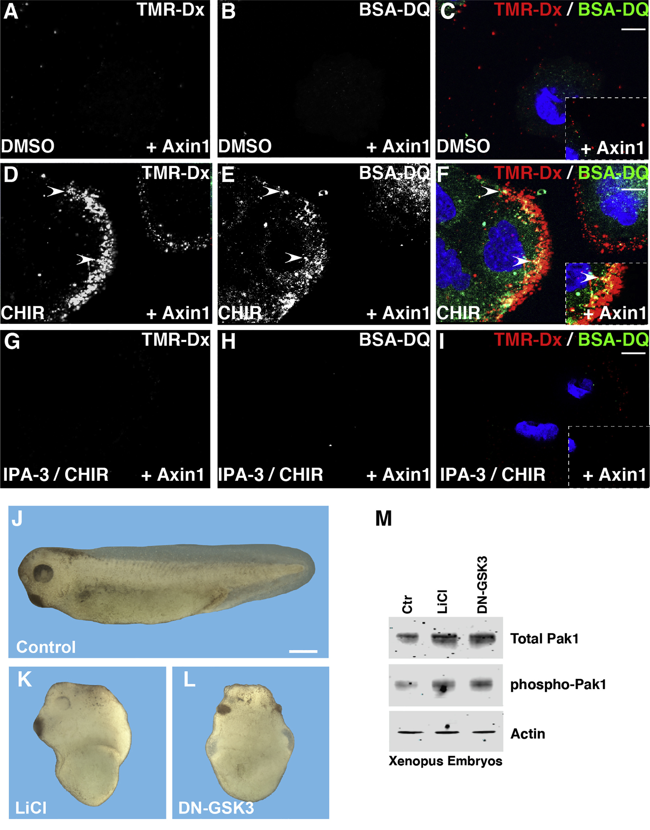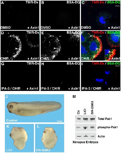 Figure 6. The Pak1 Inhibitor IPA-3 Blocks Endocytosis of Macropinocytic Vesicles and Traffic into BSA-Degrading Lysosomes(A) Macropinocytic uptake of TMR-dx 70 kDa (red) in Axin1 reconstituted HCC cells treated with DMSO.(B) BSA-DQ (green) in Axin1-reconstituted HCC cells treated with DMSO.(C) TMR-dx and BSA-DQ merged in Axin1 reconstituted HCC cells treated with DMSO.(D) CHIR increased macropinocytic uptake of TMR-dx after 20 min in Axin1 reconstituted HCC cells.(E) CHIR increased BSA-DQ in Axin1 reconstituted HCC cells.(F) TMR-dx and BSA-DQ merged in Axin1-reconstituted HCC cells treated with CHIR. Note that macropinocytic vesicles are red and that as BSA-DQ is degraded they turn yellow. As lysosomes mature and become acidified, TMR-dx fluorescence becomes extinguished and BSA fluorescence remains. Arrowheads indicate vesicles in which TMR-dx and BSA-DQ are co-localized.(G) Pak1 inhibitor, IPA-3, blocks TMR-dx uptake induced by CHIR.(H) CHIR-induced increases in BSA-DQ were blocked by IPA-3.(I) TMR-dx and BSA-DQ merged in Axin1 reconstituted HCC cells treated with CHIR and IPA-3. Scale bars, 10 μm.(J) Phenotype of control Xenopus embryos.(K) Phenotype of Xenopus embryos treated with LiCl (300 mM in 0.1à MMR saline solution for 7 min at 32-cell).(L) Phenotype of embryos injected with DN-GSK3 mRNA (150 pg into each blastomere at the vegetal pole at 4-cell stage). Note embryo dorsalization with loss of trunk-tail structures and expansion of head structures, indicating hyperactive early Wnt activity. Scale bar, 0.5 mm.(M) In the same embryos, LiCl treatment or DN-GSK3 mRNA injection stabilized levels of total Pak1 at blastula, which was accompanied by a similar increase in phospho-Pak1 (the active form). Actin was used as loading control. |