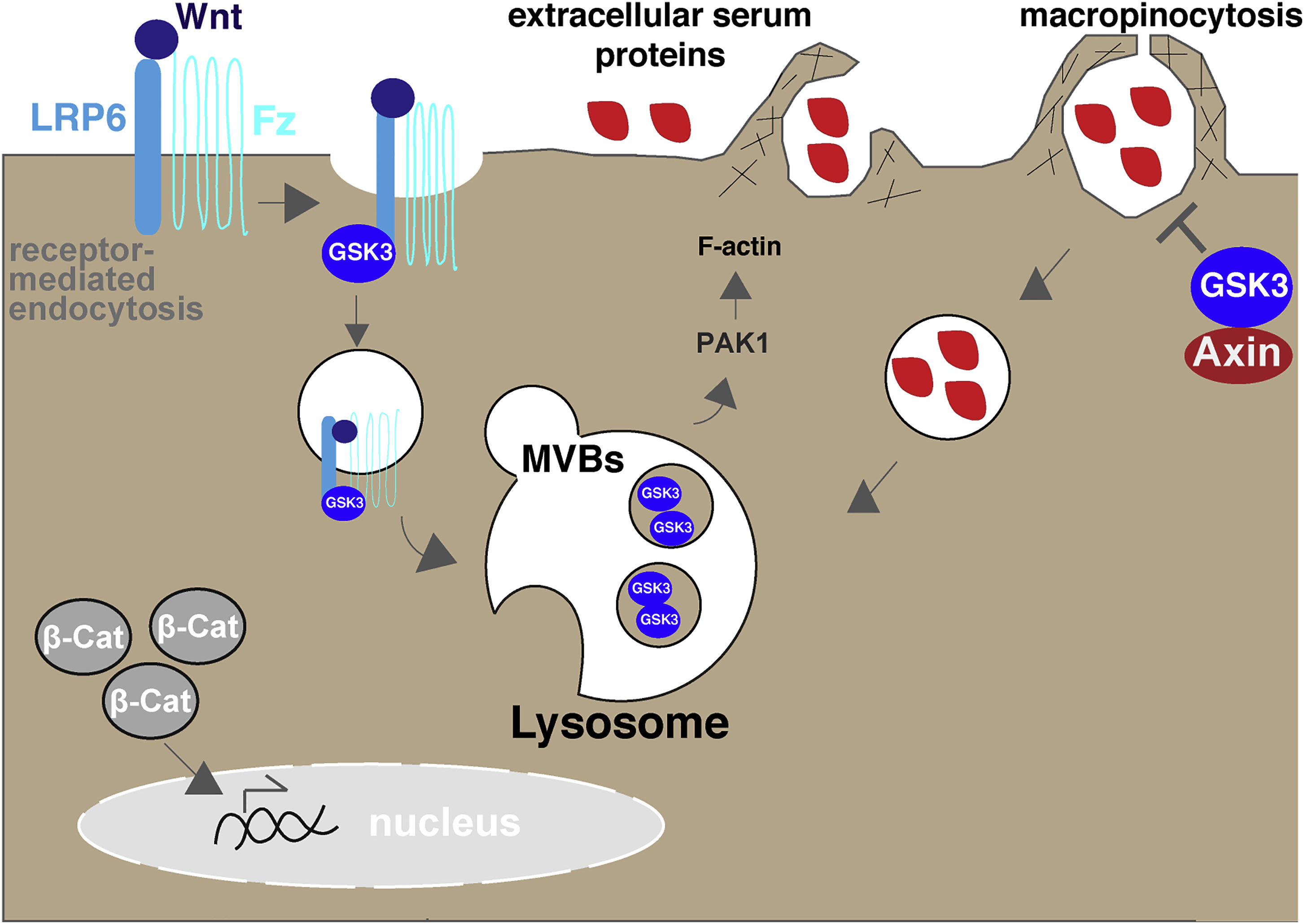 Figure 7 Model of the Intersection among Receptor-Mediated Endocytosis of Wnt, Macropinocytosis, and Lysosomes During Wnt signaling, micropinocytosis of the LRP6/Fz receptor results in the sequestration of GSK3 (blue) inside the intraluminal vesicles of MVBs. As cytosolic levels of GSK3 decrease, Pak1 induces the submembraneous actin machinery to form macropinocytic cups that close and engulf macromolecules (red) from the surrounding medium. The axin/GSK3 complex represses macropinocytosis. When Axin1 is mutated, GSK3 is unable to repress the actin machinery, resulting in a prodigious amount of nutrient uptake by macropinocytosis. When GSK3 is inhibited pharmacologically or with DN-GSK3, macropinocytosis is stimulated to a similar degree than that caused by Wnt3a ligand treatment. The results presented in this study point to a hitherto-unappreciated role for GSK3 and axin in the suppression of macropinocytosis in basal conditions. |