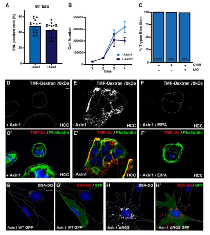 Figure S1. Axin1 Reconstitution Does not Change Cell Proliferation or Death Rates in Alexander HCCs; Related to Figure 1 (A) No significant differences in proliferation were observed in Alexander HCC±Axin1 cells. EdU incorporation for 90 minutes marks cells in S-phase; % of EdU-positive nuclei per field are represented as dot scatter plots. (B) Growth curve analyses of Alexander±Axin1 HCC cells over four days. No significant differences in cell count were observed until confluency, indicating an increased sensitivity to contact inhibition. (C) Viability assays of Alexander HCC±Axin1 cells by trypan blue exclusion. No effects on cell death were detected by with GSK3 inhibitors, LiCl or CHIR99021 using a Vi-cell Coulter Viability Analyzer (viability of 99% for 8 nM CHIR99021 and 98% for 40 mM LiCl after 30 min). (D-Fâ) TMR-Dextran (red) and phalloidin (green) colocalization in HCC±Axin1 cell colonies at low magnification. Note that macropinocytosis is very active in cells lacking Axin1 and that inhibition of the Na+/H+ exchange pump with EIPA blocks this macropinocytosis. High-power inset in Eâ shows that TMR is engulfed in vesicles surrounded by the actin cytoskeleton. (G and Gâ) Transfection of wild-type Axin1-GFP did not increase uptake of BSA-DQ in the transfected cell. (H and Hâ) DRGS Axin1-GFP overexpression, which inhibits Axin activity, increased BSA-DQ digestion when compared to the untransfected control cell. Scale bars, 10 μm. |