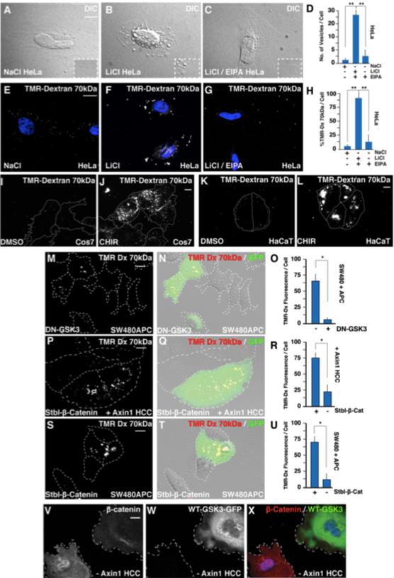 Figure S2. Cells Treated with LiCl Develop Large Endocytic Vesicles that are Blocked by Treatment with the Macropinocytosis Inhibitor EIPA; DN-GSK3-GFP, Stabilized β-catenin, and WT-GSK3-GFP Regulate Macropinocytosis; Related to Figure 2 (A-D) LiCl increased formation of large vesicles visualized by light microscopy after 20 min in HeLa cells, in a process that was blocked by EIPA. (E-H) LiCl increased TMR-dextran 70 kDa macropinocytosis, which was inhibited by EIPA in HeLa cells. (I-L) CHIR treatment increased TMR-dextran 70 kDa in Cos7 or HaCaT cells indicating the effects of GSK3 inhibition on macropinocytosis were not cell-type specific. (M-O) DN-GSK3-GFP transfection increased macropinocytic uptake of TMR in transfected SW480+APC colorectal carcinoma cells, compared to nontransfected neighboring cells. (P-U) Stabilized β-catenin-GFP (cells with green fluorescence) transfection induced TMR dextran macropinocytosis in HCC or SW480 cells reconstituted with Axin1 or APC, respectively. Note that this experiment shows that the transcriptional program caused by β-catenin overexpression is able to induce macropinocytosis, confirming a previous report by Redelman-Sidi et al. (2018); macropinocytosis can also be induced acutely in the absence of new protein synthesis by Wnt3a or GSK3 inhibitors, as demonstrated in the main text of this paper. Scale bars, 10 μm. (V-X) Overexpression of WT-GSK3-GFP results in the depletion of nuclear β-catenin in Alexander HCC cells mutant for Axin1. This indicates that GSK3 can induce the phosphorylation and degradation of β-catenin even in the absence of functional Axin1. |