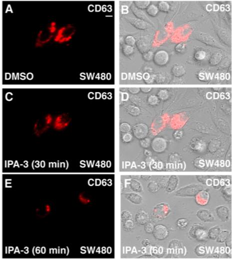 Figure S5. Pak1 Inhibition with IPA-3 Decreased Late Endosomal Marker CD63 Fluorescence; Related to Figure 6 (A-F) High levels of CD63-RFP in SW480 colorectal cancer cells were reduced by IPA-3 after 60 min of incubation visualized by live cell imaging microscopy (still images from Movie 3). CD63 marks the intraluminal vesicles of MVB/endolysosomes, indicating that the abundant lysosomes of SW480 cells require sustained Pak1 activity, which is required for macropinocytosis. Scale bars, 10 μm. |