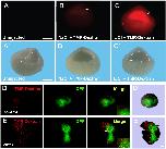 Figure 3 In Vivo Inhibition of GSK3 by LiCl Microinjection Causes Increased Macropinocytosis in the Blastula Cavity (A) Uninjected Xenopus embryos had no detectable fluorescence at blastula (n = 44). (Aâ²) Blastocoel in uninjected embryos delineated in the visible light image. (B) Controls injected with NaCl did not activate macropinocytosis (n = 127; 27% of half-embryos had small fluorescent spots of damaged cells but lacked uniform staining). Embryos were injected at midblastula and cultured for one hour before fixation and bisection. (Bâ²) Blastocoel in NaCl injected embryos delineated in the visible light image. (C) LiCl microinjection at midblastula stage increased TMR-dx 70 kDa uptake in blastocoel-lining cells in Xenopus embryos (n = 111 half-embryos, 78% with uniformly increased macropinocytosis in the blastocoel, 2 independent experiments). (Câ²) Blastocoel in LiCl injected embryos delineated in the visible light image. Scale bar, 0.35 mm. (D) Ectodermal explant from a control embryo microinjected into one blastomere with 300 pg mGFP mRNA at the four-cell stage, cultured until late blastula (stage 8.5), and incubated with 1 mg/mL of TMR-dx for 1hr in Steinbergâs solution (n = 13). Note the lack of macropinocytic puncta. (Dâ²) Contour of the ectodermal explant in control embryo in visible light. (E) Ectodermal explant co- injected with 10 pg of xWnt8 and mGFP mRNAs and incubated for 1 h with TMR-dx. Note that xWnt8 mRNA stimulates macropinocytosis of TMR-dx in distinct puncta in cells injected with mRNA and in the immediate surrounding cells (n = 20). (Eâ²) Contour of the ectodermal explant in xWnt8 injected embryo in visible light. Scale bars, 10 μm. |