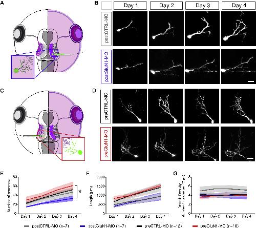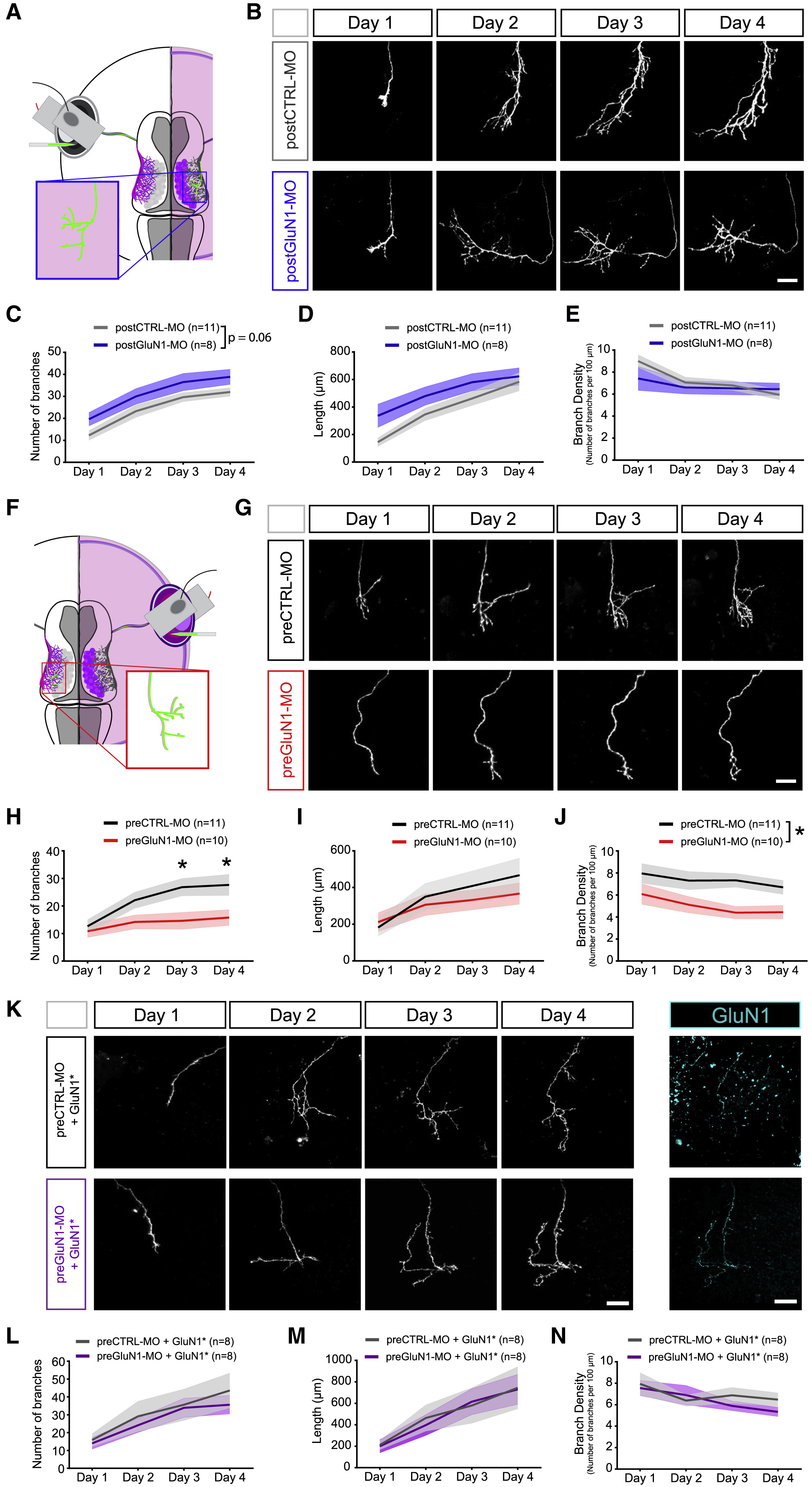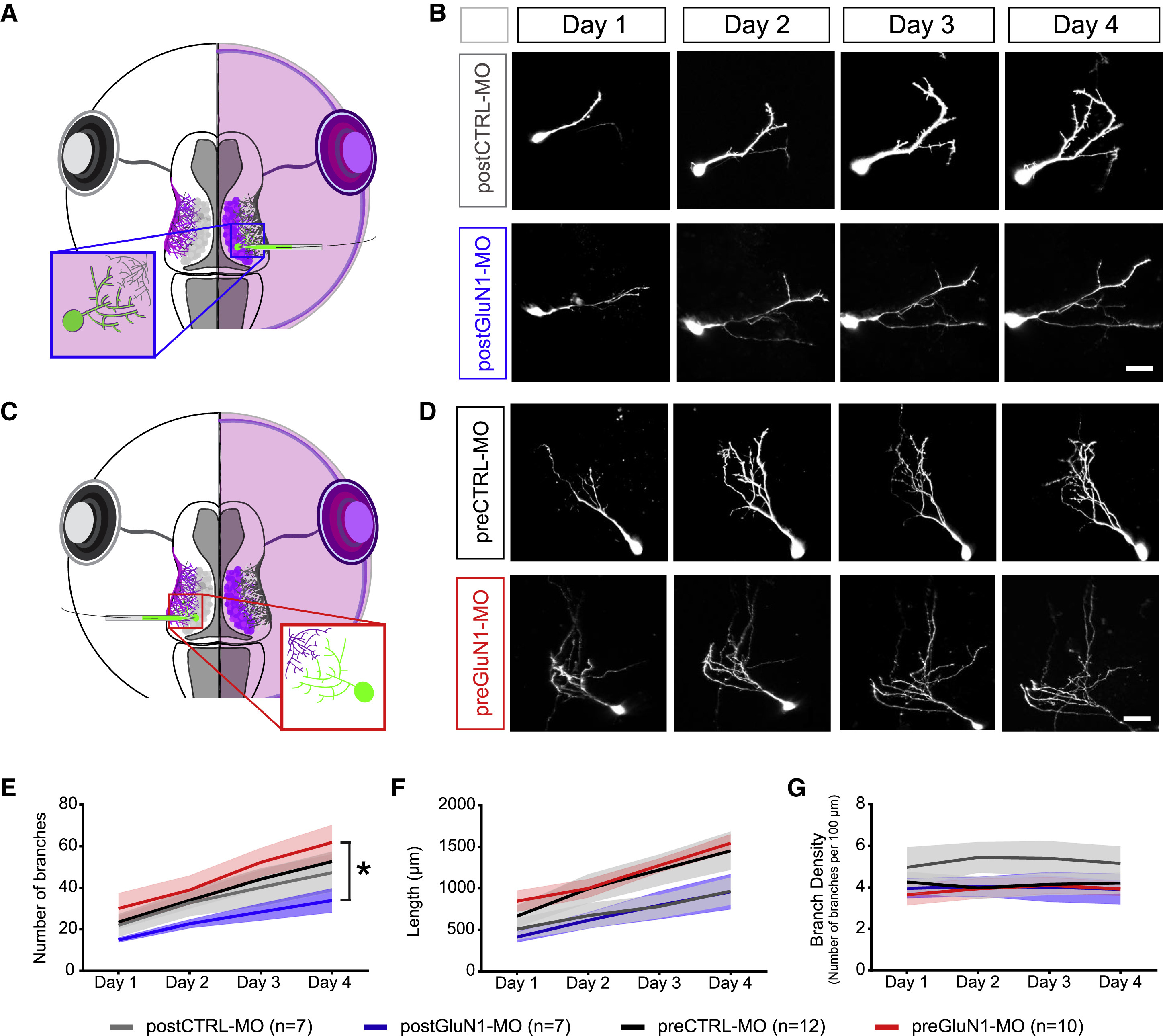 (EâG) Morphometric analysis of dendritic branch number (E), total dendritic arbor length (F), and branch density (number of branches per 100 μm) (G) over 4 days (postCTRL-MO [n = 7, gray], postGluN1-MO [n = 7, blue], preCTRL-MO [n = 12, black], and preGluN1-MO [n = 10, red]). Because pre- and postCTRL-MO groups were not significantly different from each other, they were grouped to allow a comparison of postGluN1-MO and preGluN1-MO conditions. n is number of cells. âp ⤠0.05, main effect by two-way repeated-measures ANOVA. Plots represent mean ± SEM.