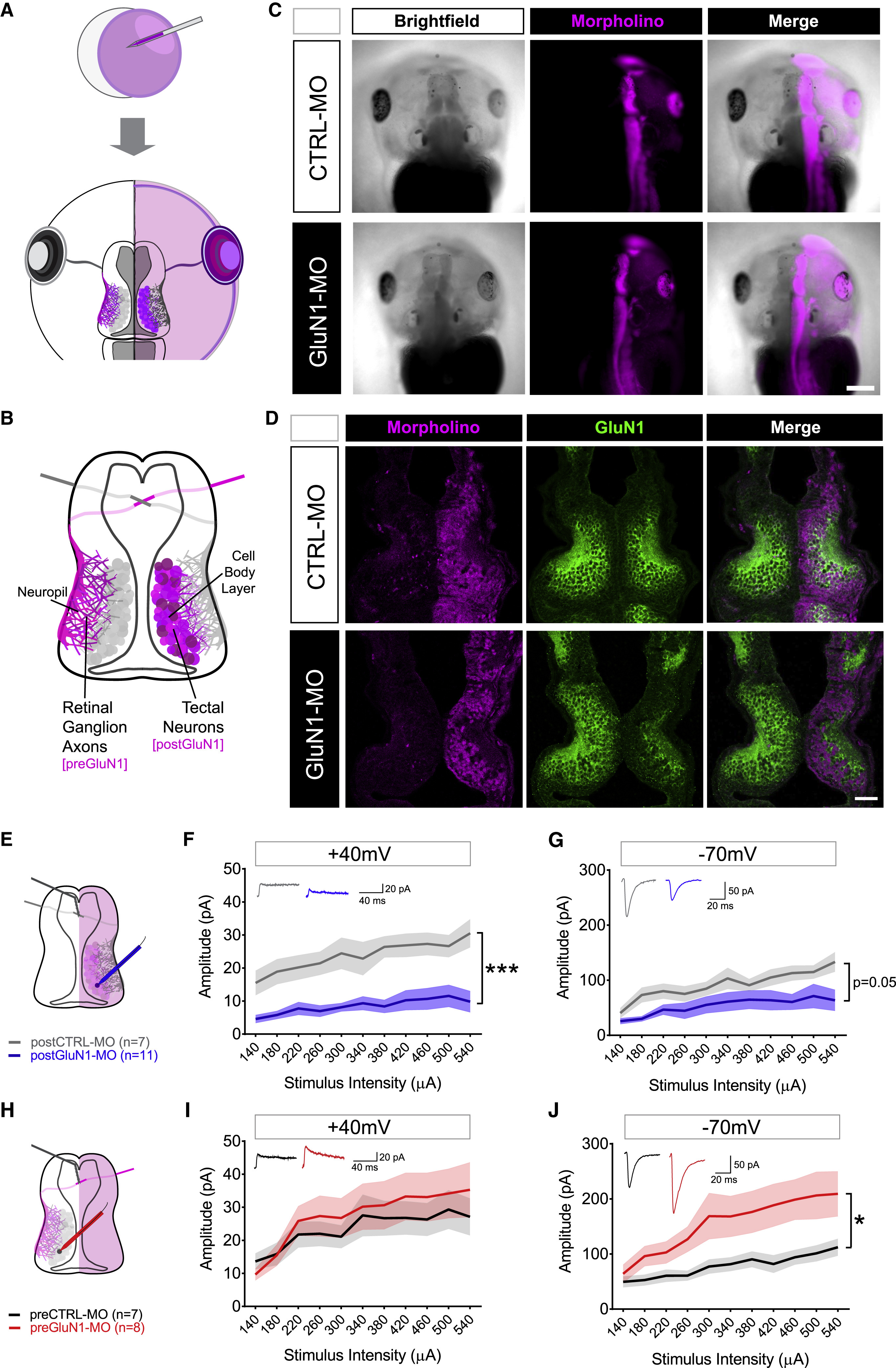 (HâJ) Tectal neuron recordings in preGluN1-MO condition (H). Input-output curves of tectal neurons measured at a holding potential of +40 mV to ascertain the NMDAR-mediated current in preCTRL-MO (n = 7, black) and preGluN1-MO (n = 8, red) conditions (I) and at â70 mV to ascertain the AMPAR-mediated current in preCTRL-MO (n = 7, black) and preGluN1-MO (n = 8, red) conditions (J). n is number of cells. âp ⤠0.05; âââp ⤠0.001, main effect by two-way repeated-measures ANOVA. Plots represent mean ± SEM.