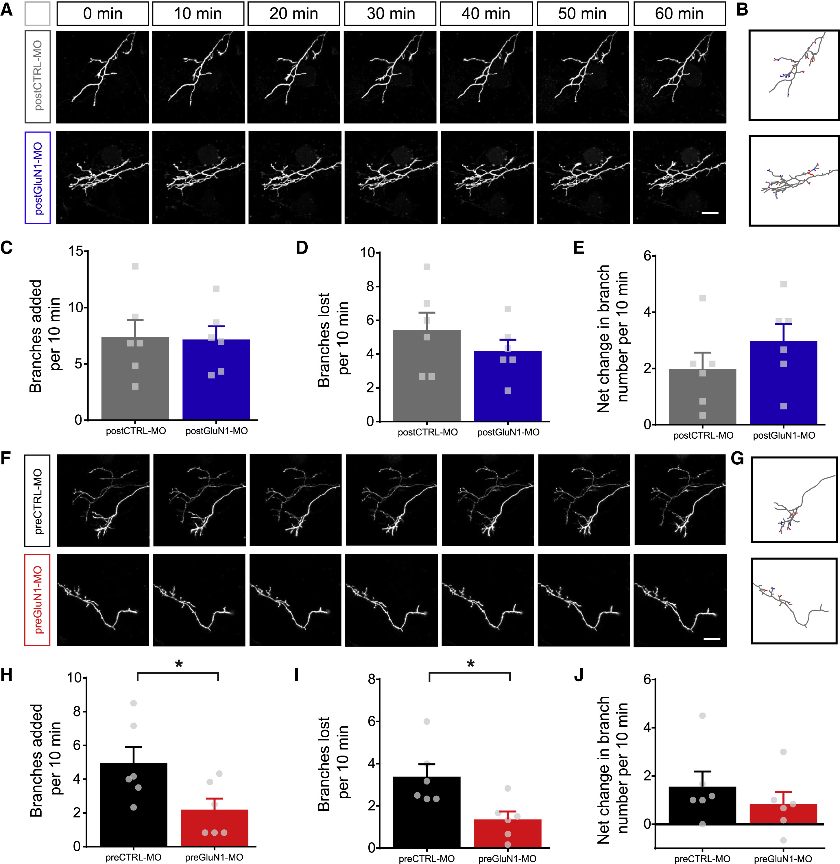 (HâJ) Morphometric analysis of the number of branches added per time point (H), number of branches lost per time point (I), and net change in branch number (J) per 10-min intervals (preCTRL-MO [n = 6, black] and preGluN1-MO [n = 6, red]). Scale bar, 20 μm. n is number of cells. âp ⤠0.05, two-tailed Studentâs t test. Plots represent mean ± SEM.