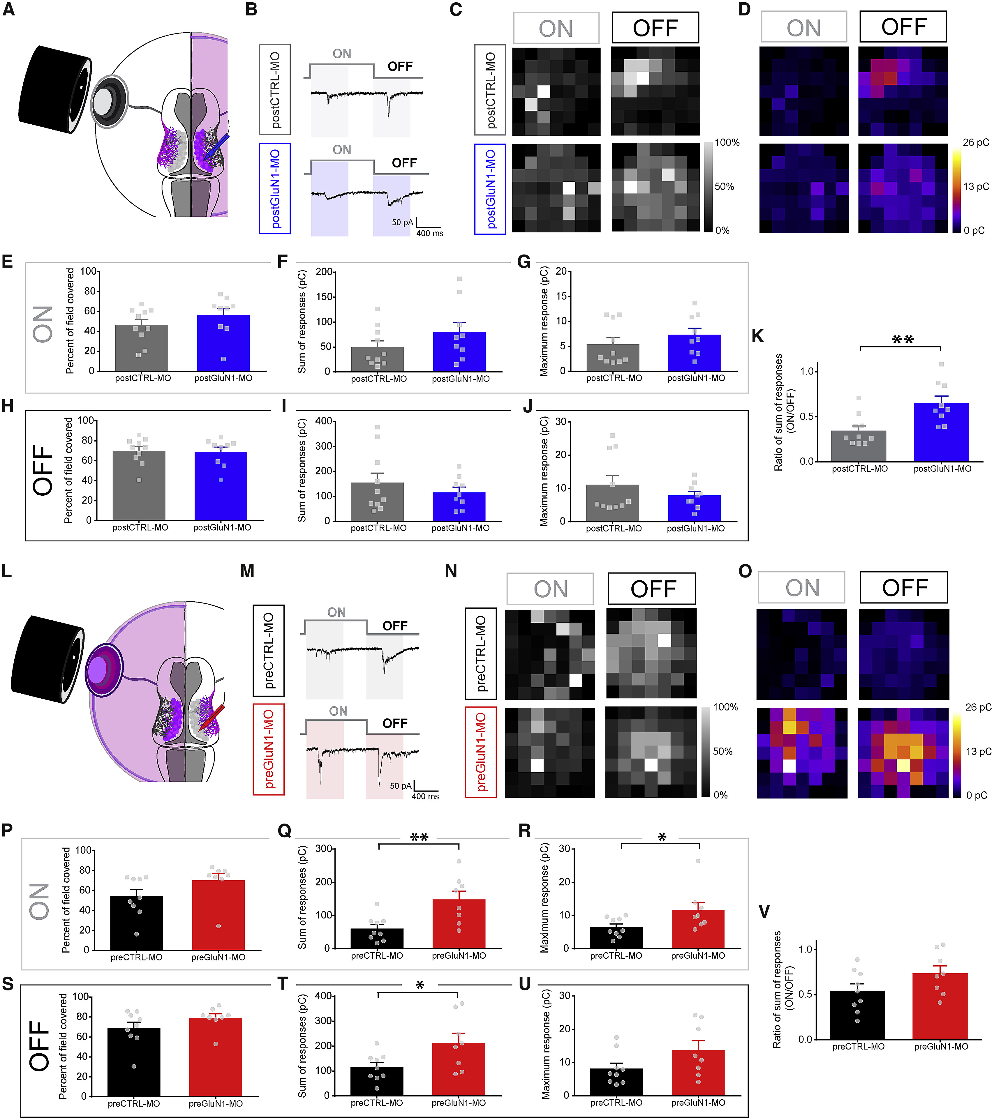 (V) Ratio of the sum of all responsive CSCs (on/off) in preCTRL-MO (n = 9, black) and preGluN1-MO (n = 8, red) conditions. n is number of cells. âp ⤠0.05; ââp ⤠0.01, two-tailed Studentâs t test. Plots represent mean ± SEM.