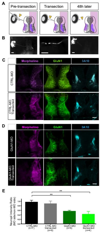 Figure S1: Transection of the optic nerve to assess preNMDARs, related to Figure 1. A. Schematic illustrating optic nerve transection (yellow arrowhead) using forceps with subsequent optic nerve degeneration 48 h later. B. Example of animal with EGFP-electroporated retina, mirroring the schematic timeline in A. Optic nerve visible via EGFP expression (left); zoom in of the transected region (middle); degeneration of axons projecting to the tectum (right). Scale bar, 200 μm). C. Examples of immunofluorescent sections of control hemimorphant midbrains. Top row: CTRL-MO, Bottom row: CTRL-MO with transected optic nerve. First column: MO-lissamine fluorescence (magenta), second column: GluN1 immunofluorescence (green), third column: RGC axon marker 3A10 (cyan). Scale bar, 100 μm. D. Examples of immunofluorescent sections of GluN1 hemimorphant midbrains. Top row: GluN1-MO, Bottom row: GluN1-MO with transected optic nerve. First column: MO-lissamine fluorescence (magenta), second column: GluN1 immunofluorescence (green), third column: 3A10 (cyan). Scale bar, 100 μm. E. Average intensity of the tectal neuropil GluN1 immunofluorescence, quantifying the ratio of the MO side/non-MO side for CTRL-MO (n = 7), CTRL-MO transected (n = 6), GluN1-MO (n = 6), and GluN1-MO transected (n = 4). N is number of animals. ** p ⤠0.01, one-way ANOVA with Tukeyâs post-test. Graph represents means ± SEM.