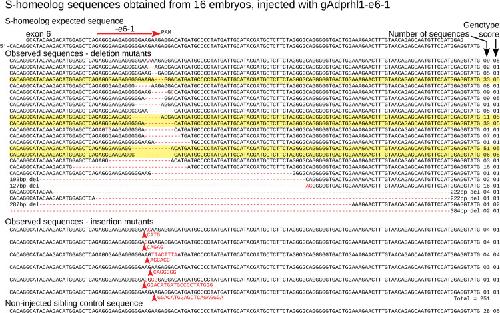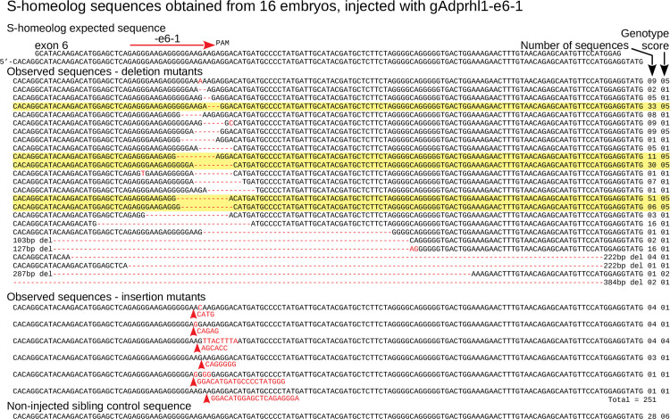 Fig 4. Targeting adprhl1 exon 6 causes near complete mutation and in-frame repair biasâS-homeolog DNA sequences.Sanger cloned DNA sequences of adprhl1 S-homeologous locus exon 6 after mutation by the gAdprhl1-e6-1 gRNA plus Cas9. Mutated sequences from the L-locus exon 6 are presented in S14 Fig. The gRNA position is shown by the red arrow placed above the expected sequence (top 2 rows, exon and genomic). Alignment of 251 (S-) DNA clones obtained from 16 tadpoles, with every sequence carrying a lesion at the gRNA binding site. Mutant nucleotide sequences are coloured red. A missense mutation is listed first, followed by deletions (red hyphens) and then insertions (red arrowheads). Frequently occurring sequences containing in-frame 3, 9 or 12 bp deletions are highlighted. The number of instances of each sequence is to the right, alongside its genotype score. |