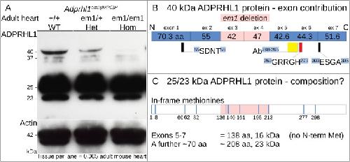 Fig 8. Mice lacking Adprhl1 exons 3 and 4 are normalâthey still produce 25 and 23 kDa ADPRHL1 proteins.A: Western blot detection of ADPRHL1 protein from individual adult mouse hearts carrying the Adprhl1em1(IMPC)H allele (em1). The 40 kDa ADPRHL1 protein was clearly lost from the em1 homozygote heart and no new species appeared in its place. Significantly though, two other major cardiac ADPRHL1 species, 25 and 23 kDa, were unaffected by the em1 deletion. Actin detection was used to normalize the samples. WT, wild type; Het, heterozygote; Hom, homozygote. Note that additional, fainter ADPRHL1 protein species were detected around 37 kDa (and 70 kDaânot shown), although their relative abundance was inconsistent in different western blot experiments. B: The contribution of coding exons to the 40 kDa ADPRHL1 protein, showing the position of 89 amino acids lost by em1 deletion (pink) relative to the peptide antibody epitope (yellow rectangle) and di-arginine sequence (red rectangle). C: Exploration of the potential composition of 25/23 kDa ADPRHL1 species. Exons 5â7 encode the C-terminal protein portion, providing 138 aa and 16 kDa to the open reading frame. A further 70 aa including a methionine to initiate translation would be needed to produce a 23 kDa protein. Blue lines signify the position of alternative in-frame methionines within the 40 kDa sequence. |