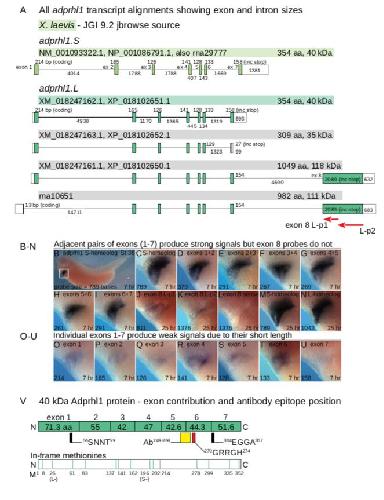 S1 Fig. Xenopus laevis adprhl1 transcripts and expression detected by exon-specific probes. A: All X. laevis adprhl1 transcript alignments showing exon and intron sizes [26]. A single RefSeq mRNA aligns to the S-locus (NM_001093322.1, plus rna29777 that includes longer untranslated regions) while the L-locus is represented by four predicted transcripts. The L-transcript (XM_018247162.1) that closely matches the S-allele was cloned from cardiac cDNA and its sequence verified. Both have been used as hybridization probes in situ (B, C, M, N). The core coding sequence, comprising exons 1 through to 7, encodes a 40 kDa Adprhl1 protein. The precise composition of the prevalent 23 kDa Adprhl1 species also found in Xenopus hearts is unknown, although some progress mapping smaller proteins in mouse is presented (Results 3.11, Fig 8, Discussion 4.3). Current vertebrate gene alignments of adprhl1 include predicted longer transcripts containing an additional 3â-exon 8, which has been assigned to the X. laevis L-allele (XM_018247161.1, plus rna10651). Red arrows mark the position of two distinct exon 8 hybridization probes. The translated sequence from the L-p1 region is conserved with mammals whereas L-p2 is divergent. B-N: Adjacent pairs of exons (1â7) produce strong signals but exon 8 probes do not. A stage 36 tadpole (left-lateral view, B) and detail images of hearts (C-N) showing adprhl1 mRNA expression detected with region-specific antisense probes. The probe size (lower left, bases) and substrate incubation time (right, 7 or 25 hours) for the colour reaction is listed on each panel. Probes covering most of the coding sequence synthesized from either S- or L-locus cDNAs will detect the combined expression from all alleles (B, C, M, N). Smaller S-allele probes that correspond to pairs of adjacent exons between 1â7 (D-I) each produce strong heart signals equivalent to that observed using the larger 789 base coding fragment (B, C). In contrast to exons 1â7, the two L-p1 and L-p2 probes detect little cardiac expression from the putative exon 8, despite prolonged substrate incubation (J, K, L-sense probe control). O-U: Tested individually, exons 1â7 produce weak signals due to their short length. A probe size greater than 200 bases would be a minimum requirement for successful hybridization in situ. V: The contribution of each coding exon to the 40 kDa Adprhl1 protein. The positions of the peptide antibody epitope (yellow rectangle), conserved di-arginine sequence (red) and the two ancestral cation coordination sites (black) are marked. All in-frame methionines are shown underneath and mostly match the mouse ADPRHL1 protein (Fig 8C). https://doi.org/10.1371/journal.pone.0235433.s001 |