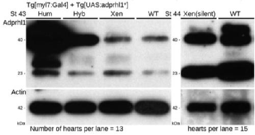 S3 Fig. Over-expression of recombinant 40 kDa Adprhl1 does not yield extra 23 kDa Adprhl1. Western blots of transgenic tadpole hearts that carried stable lines of the Tg[myl7:Gal4] driver and one of a series of Tg[UAS:adprhl1] responders designed to over-express variants of 40 kDa Adprhl1 protein. Stage 43â44 heart extracts were probed with Adprhl1 antibody, with Actin detection used to normalize the samples. Hum corresponds to a Tg[UAS:human ADPRHL1] responder that induces large-scale synthesis of human-species ADPRHL1 protein in tadpole hearts. This transgene cDNA sequence is sufficiently different from Xenopus to evade the endogenous translational control mechanism that normally limits the production of Adprhl1. Hyb corresponds to the Tg[UAS:hum1-52-Xen53-354 adprhl1] responder that over-synthesizes a human-Xenopus hybrid form of Adprhl1 that also escapes translational control. Xen denotes a Tg[UAS:Xenopus adprhl1] transgene. Using unmodified Xenopus adprhl1 cDNA, transgene mRNA transcription is activated but no additional recombinant protein accumulates [10]. WT equates to control (wild type) hearts. On a separate gel with a higher signal exposure, Xen(silent) denotes the Tg[UAS:Xenopus adprhl1(silent 1-282bp)] transgene containing silent nucleotide changes to the 5â-Xenopus cDNA. This transgene partially evaded endogenous control and recombinant Adprhl1 accumulated in a fraction of the cardiomyocytes up to stage 42. However, there is a technical barrier to performing western blot analysis of transgenic hearts at these early stages. The time required to identify double-positive embryos by the transgenesâ marker eye fluorescence and subsequent sample preparation in the numbers necessary to obtain a signal is prohibitive. The silent mutation transgene gave a transient protein induction [10] and no additional Adprhl1 was detected in this sample prepared from stage 44 hearts. In hearts that synthesized excess 40 kDa hybrid Adprhl1, there was no commensurate increase in the abundance of the 23 kDa protein detected by the Adprhl1 antibody. It suggests the 23 kDa Adprhl1 species is not a processed fragment of the full length protein. Of course, this conclusion depends on the hybrid and natural Xenopus forms of Adprhl1 behaving equivalently. There are just 21 amino acid differences between the two variants. https://doi.org/10.1371/journal.pone.0235433.s003 |