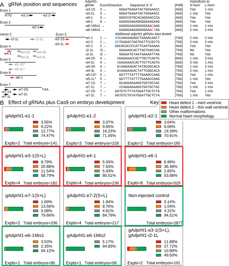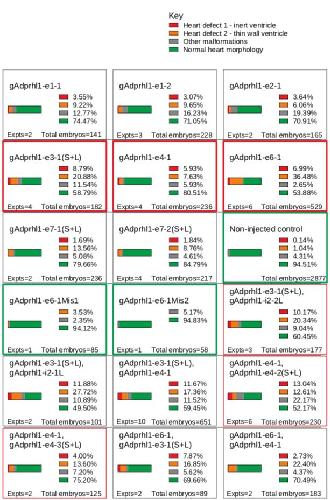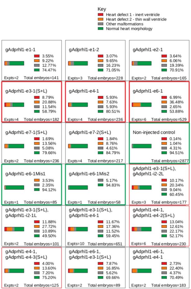 S8 Fig. Adprhl1 gRNAsâFull list of gRNA experiments and embryo phenotype frequencies. Parts-of-whole charts showing the frequency of stage 44 tadpole phenotypes that occurred after injection of adprhl1 gRNAs along with Cas9 protein into one-cell stage embryos. The number of independent experiments and total number of embryos assessed is given under each chart. Red rectangles surround graphs for gRNAs whose activities were also examined by DNA sequencing. Green rectangles denote control gRNAs and also a graph presenting the cumulative total for non-injected sibling tadpoles assayed in the experiments. The highest frequencies of heart defects were detected using the gAdprhl1-e3-1 and in particular the -e6-1 gRNA. The lower seven panels show the consequence of combining gRNAs that hybridize to two genomic regions of adprhl1 into a single injection. None of these combinatorial gRNA experiments increased heart defect frequencies beyond that obtained by gAdprhl1-e6-1 alone. Nonetheless, sequencing data was analysed for experiments where exons 3 and 4 were targeted at neighbouring positions to determine if resulting lesions contained deletions between the DSB sites (see S12 Fig). https://doi.org/10.1371/journal.pone.0235433.s008 |