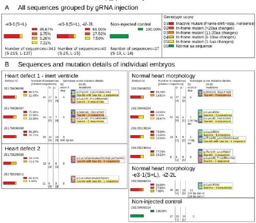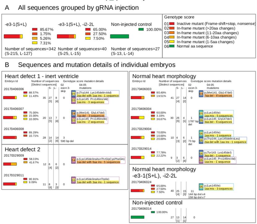 S10 Fig. Exon 3 classification of mutated adprhl1 sequencesâMissense mutations are likely to retain function. A: All DNA sequences grouped by gRNAs injection. Each DNA sequence of adprhl1 exon 3 obtained after gRNA plus Cas9-mediated mutation was assigned a genotype score (a number code), based on the size of amino acid sequence modification it encoded. Parts-of-whole charts record the frequency of these genotype scores tallied for all embryos that received the -e3-1(S+L) gRNA (left chart), an embryo injected with a combination of neighbouring -e3-1(S+L) and -i2-2L gRNAs (centre chart), and a non-injected control embryo (right chart). The total number of S- and L-locus sequences analysed is listed below each chart. The key to interpret the genotype score is also included (far right). The inclusion of the -i2-2L gRNA induced larger deletions at the L-locus that would lead to exon 3 skipping, as shown by the increased proportion of score 02 sequences. B: Sequences and mutation details of individual embryos. Separate charts for 11 of the embryos, including 5 tadpoles that developed heart defects, 5 that developed normally and the one non-injected sibling. Columns list the number of sequences and the number of distinct sequences (in square brackets) for each embryo, plus the presence of larger deletions (and their size) that skip exon 3 and score 02. More importantly, for those embryos harbouring subtle mutations that scored 04 or 05, the precise amino acid change is also given. A standard nomenclature for protein sequence variations is used to describe the changes, with a simplified summary (highlighted) underneath stating whether the mutation caused a missense, deletion or aa insertion modification. Highlight colour matches the genotype score of the sequence. The rectangle border colour denotes a missense (teal), net deletion (blue) or net insertion (violet). At this position within exon 3, wherever missense mutations were found (eg p.(Lys145Ile)), the tadpole had preserved a normal heart morphology. |