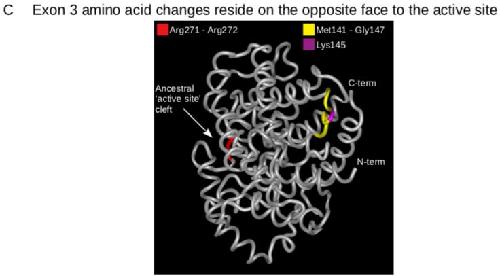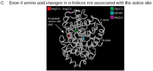 S13 Fig. Exon 4 classification of mutated adprhl1 sequencesâIncomplete mutation rarely causes heart defects. [continued] C: Structure model of X. laevis Adprhl1 protein backbone, oriented with the ancestral active site cleft to the left and facing away (Arg271-Arg272 coloured red). Exon 4 encodes a whole number of codons, contributing 47 amino acids. The start and end points of exon 4-derived amino acid sequence lie in close proximity within the model. Mutations induced by the three exon 4 gRNA positions are dispersed (Gly172 green, Gln191 blue, His 213 magenta), but non reside on the same face as the active site. https://doi.org/10.1371/journal.pone.0235433.s013 |