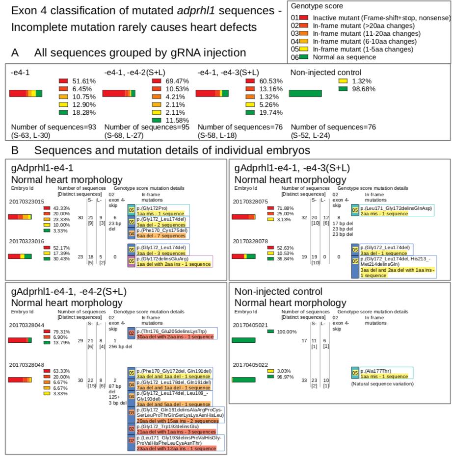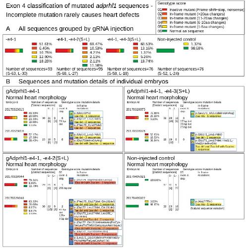 S13 Fig. Exon 4 classification of mutated adprhl1 sequencesâIncomplete mutation rarely causes heart defects. A: All DNA sequences grouped by gRNA injection. Parts-of-whole charts record the frequency of sequence genotype scores tallied for all embryos that received Cas9 and gRNAs targeting adprhl1 exon 4. The gAdprhl1-e4-1 gRNA was injected individually (far-left chart) and in combination with the neighbouring -e4-2(S+L) (centre-left chart) or -e4-3(S+L) gRNAs (centre-right chart), while sequences from non-injected control embryos were also compared (far-right chart). The total number of S- and L-locus sequences analysed is listed below each chart. The key to interpret the genotype score is also included. Mutation at exon 4 was extensive but incomplete and some wild-type sequences persisted for all combinations of gRNAs tested. B: Sequences and mutation details of individual embryos. Separate charts for 8 typical embryos with normal heart formation, including two representing each gRNA mixture plus sibling controls. Columns list the number of sequences and the number of distinct sequences (in square brackets) for each embryo, plus the presence of larger deletions (and their size) that skip exon 4 and genotype score 02. For smaller in-frame lesions, the precise amino acid change is also given. For these attempts to disrupt exon 4, most tadpoles retained a small proportion of wild-type sequence alleles. Of two presented here with 100% mutation, the reason their hearts were unaffected could not be determined conclusively. Nonetheless, one featured a subtle missense substitution while the second contained a deletion of 3 amino acids that would shorten an α-helix. They were also both notable for harbouring alleles likely to skip exon 4 from the mature mRNA https://doi.org/10.1371/journal.pone.0235433.s013. |