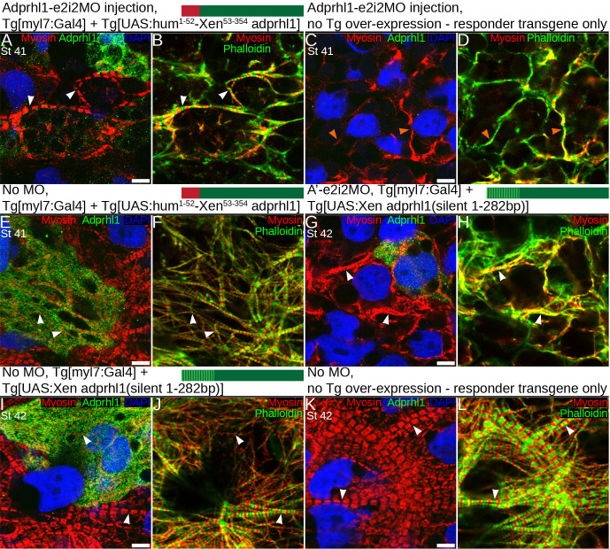 Fig 2. Limited recovery of cardiac myofibril assembly in adprhl1 morpholino injected embryos by transgenic synthesis of recombinant 40 kDa Adprhl1 proteins.Experiments that combine adprhl1 MO knockdown with two distinct transgenes engineered to achieve adprhl1 over-expression. This is the concise version of S2 Fig. For brevity, Fig 2 presents only the high magnification (D and E) images that reveal ventricle wall myofibril patterns within the experimental hearts. The extended figure additionally includes the morphology of each ventricle, the extent of Adprhl1 protein production within, plus squares to locate the position of the myofibril images within each ventricle. A, B: Cardiomyocytes within the heart ventricle wall (anterior surface) of a stage 41 tadpole that was injected with the RNA-splice interfering MO, Adprhl1-e2i2MO, into dorsal (D-2/4) blastomeres. Additionally, it carried binary transgenes to over-express recombinant Adprhl1 protein, consisting of Tg[myl7:Gal4] driver and the Tg[UAS:human1-52-Xenopus53-354 adprhl1] responder. Scale bar = 5 μm (all panels). Fluorescence image (A) shows anti-Adprhl1 immunocytochemistry (green), anti-myosin (red) and DAPI-stained nuclei (blue). The second panel (B) displays a merge of myosin and phalloidin actin stain, with the phalloidin coloured green to evaluate signal overlap. C, D: Ventricle cardiomyocytes from a sibling tadpole that received the same Adprhl1-e2i2MO injection but carried only the UAS-responder transgene and hence did not produce excess recombinant Adprhl1. E, F: A double transgenic sibling that synthesized recombinant human-Xenopus hybrid Adprhl1 but was not injected with the MO. G, H: Ventricle cardiomyocytes from a second experiment, a stage 42 tadpole that was injected with Adprhl1-e2i2MO and carried the Tg[myl7:Gal4] driver but a different Tg[UAS:Xenopus adprhl1(silent 1-282bp)] responder transgene. This incorporates silent nucleotide changes (synonymous substitutions) to the cDNA sequence in order to partially evade endogenous translational regulation. I, J: Ventricle cardiomyocytes of a double transgenic, silent mutation, sibling tadpole that synthesized recombinant Xenopus Adprhl1 but was not injected with the MO. K, L: A non-injected sibling control harbouring only the silent mutation responder transgene that did not produce excess recombinant Adprhl1. Paired white arrowheads indicate Z-disc sarcomere positions, orange arrowheads denote non-striated filaments. V, ventricle; OT, outflow tract. |