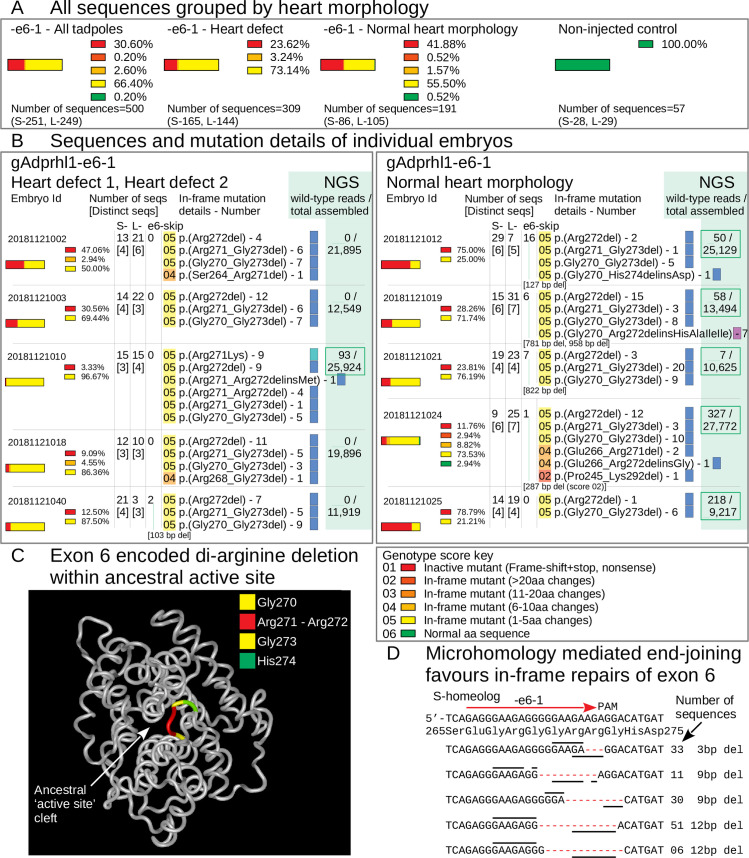 Fig 5. Exon 6 classification of mutated adprhl1 sequencesâsmall in-frame deletions responsible for heart defects.A: All cloned Sanger sequences grouped by heart morphology. Parts-of-whole charts record the frequency of exon 6 sequence genotype scores tallied for all embryos that received Cas9 and the gAdprhl1-e6-1 gRNA (far-left chart), or divided into two groups representing tadpoles with heart defects (centre-left chart) versus those whose hearts developed normally (centre-right chart). Sequences from non-injected control embryos were also compared (far-right chart). The total number of S- and L-locus sequences analysed is listed below each chart. The key to interpret the genotype score is included (below B). There was just one wild-type sequence detected among 500 examined and for this region of exon 6, there was a disproportionately high frequency of in-frame deletion mutations. B: Sequences and mutation details of individual embryos. Separate charts for 10 of the embryos, including 5 tadpoles with heart defects and 5 with normal heart morphology. Columns list the number of Sanger sequences and the number of distinct sequences (in square brackets) for each embryo, plus the presence of larger deletions (and their size) that would skip exon 6. Most importantly, the precise amino acid changes are given for all of the in-frame lesions. A standard nomenclature for protein sequence variations is used to describe the changes. Highlight colour matches the genotype score of the sequence. The colour of the small rectangle denotes a missense (teal), net deletion (blue) or net insertion (violet). Three specific amino acid deletions were common to many of the embryos: a single aa loss of Arg272, loss of 3 aa Arg271 to Gly273, or loss of 4 aa Gly270 to Gly273. Deletion of these amino acids must eliminate Adprhl1 protein function and thus be responsible for the cardiac malformations caused by the -e6-1 gRNA. The far-right column shows next generation sequence data (NGS, Materials and Methods 2.5) employed specifically to search for the presence of wild-type reads at the gRNA site. For the majority of injected embryos with a heart defect, increasing the depth of mutation analysis did not reveal any wild-type alleles. In contrast, wild-type alleles were found in each of the tadpoles with a normal heart. C: Structure model of X. laevis Adprhl1 protein backbone, oriented with the ancestral active site foremost [10]. The di-arginine (Arg271-Arg272 coloured red) sequence frequently deleted by the -e6-1 gRNA resides in a loop at the heart of the active site (Gly270, Gly273 yellow, His274 green). D: S-locus sequence at the -e6-1 gRNA site. Five rows represent common in-frame deletions of 3, 9, 9, 12 and 12 bp. Lines above and below the rows mark short direct repeats of nucleotide sequence utilized by the microhomology mediated end-joining DSB repair pathway. |