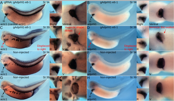Fig 6. Onset of ventricle growth defects after mutation of adprhl1 exon 6.A, B: Expression of actc1 (heart and skeletal muscle, A) and adprhl1 (B) mRNAs in stage 34 tadpoles after adprhl1 exon 6 mutation using the gAdprhl1-e6-1 gRNA plus Cas9. Left-lateral view of tadpole and detail left, right and ventral views of heart region presented. C, D: Older stage 39 tadpoles that received the same exon 6 mutation. E, F: Sibling non-injected stage 34 tadpoles. G, H: Sibling non-injected stage 39 tadpoles. By stage 39, exon 6 mutated tadpoles show ventricle defects and early signs of cardiac oedema. One ventricle (C) is displaced towards the right side of the tadpole and has a malformed apex region. The second ventricle (D) is also displaced and has a faint adprhl1 signal, suggesting a thinner myocardial wall. Red arrows denote aberrant morphology. H, heart; L, R, V, left, right and ventral views. |