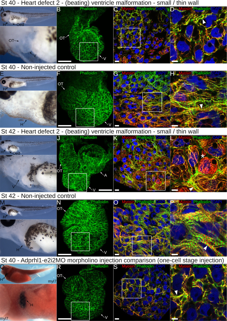 Fig 7. Impaired ventricle myofibril assembly caused by mutation of adprhl1 exon 6.A: Developing cardiac oedema typical of a stage 40 tadpole after injection of the gAdprhl1-e6-1 gRNA plus Cas9. Left-lateral view of tadpole and detail of heart region presented. The oedema increased embryo transparency so that the small ventricle became visible at an earlier stage compared to controls. B-D: Fluorescence images of the dissected heart ventricle placed with the anterior surface uppermost (B) and displaying merged signals (C, D) of phalloidin actin filaments (green), anti-myosin filaments (red) and DAPI nuclei (blue). The white square (B) denotes the position of the ventricular cardiomyocytes (C) and the white square (C) in turn marks the further magnified image (D). The ventricle is small compared to controls. Cardiomyocytes either have few assembled muscle filaments or contain disarrayed myofibrils with poorly defined sarcomeres (arrowhead, D). Scale bars = 100 μm (B), = 10 μm (C) and = 5 μm (D). E-H: Non-injected sibling control stage 40 tadpole and dissected cardiac ventricle. The cardiomyocytes of the ventricle wall assemble myofibrils that extend in a perpendicular to chamber direction (horizontal in the image, H). Discrete sarcomeres are visible (arrowhead, H). I: A typical stage 42 tadpole mutated with the -e6-1 gRNA and Cas9. The cardiac oedema and small ventricle are the only overt malformations. J-L: The dissected heart has the anterior ventricle surface uppermost, while its aberrant shape positions the outflow tract to the left of the atria after mounting (J)(in controls, the outflow is folded in front of the atria). There is mosaicism amongst the ventricular cardiomyocyte population (K, L), with round non-functional cells (asterisk *, L) and also elongated cells containing disarrayed myofibrils (arrowhead, L). M-P: Non-injected sibling control stage 42 tadpole and dissected ventricle. The tadpole epidermis is now transparent allowing simple assessment of cardiac morphology (M). Myofibrils are packed together (O) and Z-disc stripes are prominent (arrowhead, P). Q-T: For comparison, a stage 40 tadpole and a dissected heart ventricle obtained after injection of the RNA-splice interfering Adprhl1-e2i2MO morpholino at the one-cell stage. This tadpole was probed for myocardial myl7 mRNA and its epidermal pigment removed by bleaching. Left-lateral view and ventral detail (Q). The heart dissected from another MO injected tadpole is small (R), with myofibril disarray (S, arrowhead, T) that is comparable to the CRISPR targeted animals. Note, injection of the MO at the one-cell stage to match the CRISPR experiments yielded a slightly milder cardiac phenotype compared to the previous four-cell stage dorsal blastomere injections due to lower MO concentration apportioned to heart forming tissue (compare Fig 2C and 2D). Oed, oedema; H, heart; V, ventricle; OT, outflow tract; A, atria. |