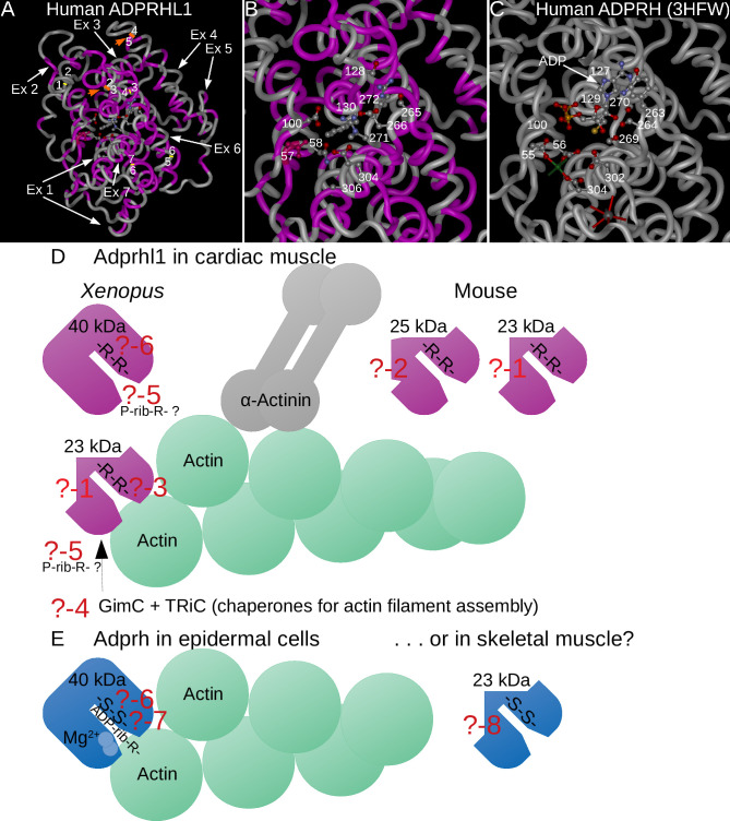 Fig 9. Questions regarding Adprhl1 (and Adprh) action.A-C: Structural model of human ADPRHL1 with protein backbone drawn as a tube (A) and magnified active site region (B) [10] that is based on the solved crystal structure of human ADPRH (3HFW) (C-active site shown only) [43]. Amino acids that are common to both proteins are coloured magenta (A, B). White arrows indicate the contribution made by each ADPRHL1 exon to the sequence, orange arrows highlight the positions encoded by the exon-2-3 and exon-4-5 boundaries, with yellow lines marking the remaining exon borders (A). The translated exon-2-3 and 4â5 boundaries reside close to each other and have parallel alignment. Thus a smaller 23 kDa ADPRHL1 form that lacks aa sequence from exons 3â4 could conceivably retain a similar protein fold. Select aa side chains within the active sites are shown as ball and sticks models. For active enzyme ADPRH, aspartates-55, 56, 302, 304 (Mg2+ coordination and catalysis), Cys129, Tyr263, serines-264, 269, 270 (substrate binding cleft) and the location of glycines-100, 127 are shown (C). A molecule of ADP occupies the active site, along with one of the two Mg2+ cations (green sphere) and a K+ ion (grey sphere) (C). For cardiac ADPRHL1, the corresponding active site residues are mostly changed. Asp57 (conserved and coloured red), Asn58, Glu302, Ala304 (no cation coordination), Phe130, Ser265, Glu266, arginines-271, 272 (changed substrate cleft), plus Asp100, Ser128 are shown (B). With this altered active site, ADP cannot be forcibly docked into the ADPRHL1 model. D, E: A deeper understanding of Adprhl1 action is required in order to describe how myofibrillogenesis is linked to chamber outgrowth in the embryo. This diagram illustrates several questions that will need to be addressed:? -1: What is the precise composition of the smaller 23 kDa Adprhl1 protein? The mouse em1 allele has already provided some information. It does not contain exons 3â4 encoded sequence but will include exons 5â6 sequence recognised by the peptide antibody.? -2: What is the composition of the additional 25 kDa mouse Adprhl1 protein? It is likely to be related to the 23 kDa species.? -3: Which sequences localize Adprhl1 to Z-disc/actin filament barbed end boundaries and what myofibril components does it associate directly with? The localization is observed when using an N-terminal epitope tag but not with the exons 5-6-specific antibody. The epitope for the peptide antibody is possibly obscured when Adprhl1 associates with myofibrils.? -4: Might Adprhl1 cooperate with the chaperones and co-chaperones that fold and assemble actin filaments? GimC and TRiC are among factors known to contribute to actin dynamics. There are many additional components of the functional sarcomere unit of myofibrils that Adprhl1 could interact with.? -5: Does Adprhl1 retain binding activity for a post-translational modification that is related to ADP-ribose? For example, an ADP-ribose modification can be partially degraded to a smaller phospho-ribose group by a pyrophosphatase or phosphodiesterase reaction.? -6: Could the substrate binding clefts of Adprhl1 and Adprh also be targets for ADP-ribosylation? Comparison of the di-arginine versus di-serine residues present in the active sites of the two proteins. Di-arginine is common among verified sites for ADP-ribosylation on arginine side chains. Moreover, serine is another acceptor site for ADP-ribosylation that can be hydrolysed by the action of Adprhl2.? -7: Does the active enzyme Adprh contain sequences that provide specificity for particular target proteins, in addition to the binding and hydrolysis of ADP-ribosylated arginine? In the illustration, Adprh is depicted acting on ADP-ribosylated actin, one of a number of known (arginine acceptor) targets of bacterial toxin ADP-ribosyltransferases. Could domains adjacent to the active site help stabilize the interaction with particular modified target proteins. Might this be the activity that is common to both Adprh and Adprhl1.? -8: Could smaller protein forms of Adprh also exist, for example in skeletal muscle? There could yet be analogy between 23 kDa Adprhl1 action in cardiac muscle and Adprh in skeletal muscle. However, evidence against this comparison would be that exon structure is not conserved between the two family members. |