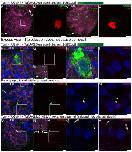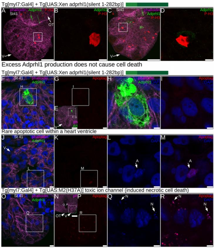 S4 Fig. Excess Adprhl1 production does not trigger cell proliferation, nor cause cell death. Tadpole heart ventricles with transgenic over-expression of 40 kDa Adprhl1 protein combined with markers of cell division (A-D) and cell death (E-R). The cardiac Tg[myl7:Gal4] driver and Tg[UAS:Xenopus adprhl1(silent 1-282bp)] responder transgenes were utilized. A-D: Two hearts showing anti-Adprhl1 (green), mitosis marker anti-phospho-Histone H3 (red) and phalloidin actin stain (magenta). White squares (A, C) denote the position of detail images (B, D). Cells undergoing mitosis were readily detected within all regions of embryonic stage 40â41 hearts. There was no correlation between excess Adprhl1 production and cell division. Mitotic cells usually had no Adprhl1 signal (B) but occasionally did contain Adprhl1 protein (D). Note, a second P-H3-positive cell (A) near to the featured cell lay deeper within the myocardial wall so was not detected by the thin optical section of the high magnification image (B). Scale bars = 100 μm (A, C), = 10 μm (B, D). E-I: Heart showing anti-Adprhl1 (green, E, F, H), ApopTag® TUNEL reaction stain (red, G, I), phalloidin (magenta, E, F, H) and DAPI (blue, F, H, I). The white square on the heart (Inset, E) locates images within the ventricle (F, G). Similarly, the squares (F, G) mark the position of detail images (H, I). The ApopTag® stain detects fragmented DNA of dying cells, caused by either apoptosis or necrotic destruction. The images focus on a cardiomyocyte on the ventricle anterior surface with excessive accumulation of Adprhl1 and a round appearance. Nevertheless, no ApopTag® signal was observed for this cell (G, I) nor indeed any Adprhl1-positive cells screened across 11 transgenic hearts. Scale bars = 100 μm (E, N), = 10 μm (F, G, J, K, O, P), = 5 μm (H, I, L, M, Q, R). J-M: Programmed cell death within the heart is a rare event during ventricle chamber outgrowth stages. Comparable images of a ventricle from a sibling transgenic tadpole (L has DAPI only). To prove the TUNEL reaction worked in situ, towards the apex, a solitary apoptotic cell was detected in an area without excessive Adprhl1 production (K, M). A typical condensed nucleus was observed with a fragmented DAPI stain (L) and intact ApopTag® signal (K, M). N-R: A further positive control for the ApopTag® detection method utilized a different responder transgene to induce necrotic cell death of the cardiomyocytes. The Tg[UAS:M2(H37A)] comprises part of a system for controllable genetic cell-ablation, producing the toxic viral ion channel M2(H37A) [55]. The resulting small malformed heart was mounted with left side uppermost, with outflow tract to the left and ventricle to the right (inset, N). The images focus on the dying ventricle (O, P), in which numerous clusters of dots were present, positive for both ApopTag® fragmented DNA and DAPI (P-R). The scattered signals indicated cardiomyocytes had ruptured and that their cellular contents and degrading DNA had dispersed within the myocardium. V, ventricle; OT, outflow tract; A, apoptotic cell remnant; N, necrotic cell death fragments. https://doi.org/10.1371/journal.pone.0235433.s004 |
