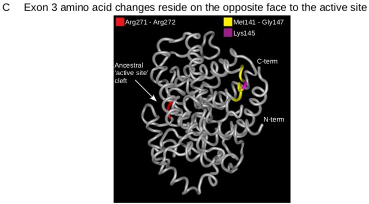 S10 Fig. Exon 3 classification of mutated adprhl1 sequencesâMissense mutations are likely to retain function. [continued] C: Structure model of X. laevis Adprhl1 protein backbone, oriented with the ancestral active site cleft to the left and facing away (Arg271-Arg272 coloured red) [10]. Exon 3 encodes a whole number of codons, contributing 41 amino acids arranged as two antiparallel α-helices. The extended loop mutated by the -e3-1(S+L) gRNA connects the two helices together and resides on the opposite face to the active site (coloured yellow and magenta). Within exon 3, the consequence of in-frame, small amino acid deletions or insertions could not be defined with certainty. Nonetheless, triplet amino acid deletions were found in the normal cohort and may have protected the heart in two tadpoles (see tadpole#20170329014), which suggested these alleles were functional. Conversely, small insertions were biased towards animals with defective hearts, including examples where just a single amino acid was inserted between residues Lys145 and Pro146. Just one mutation gave apparently conflicting results. A 21 bp deletion resulting in a loss of 7 amino acids (p.(Met141_Gly147del)) was present in the heart defect group but also as the sole score 04â05 mutation detected in a normal tadpole (see tadpoles#20170406007, #20170406003). The model of Adprhl1 structure provided some context for the observed sequence modifications. It is plausible that a three amino acid deletion could be accommodated without loss of structural integrity (C). https://doi.org/10.1371/journal.pone.0235433.s010 |
