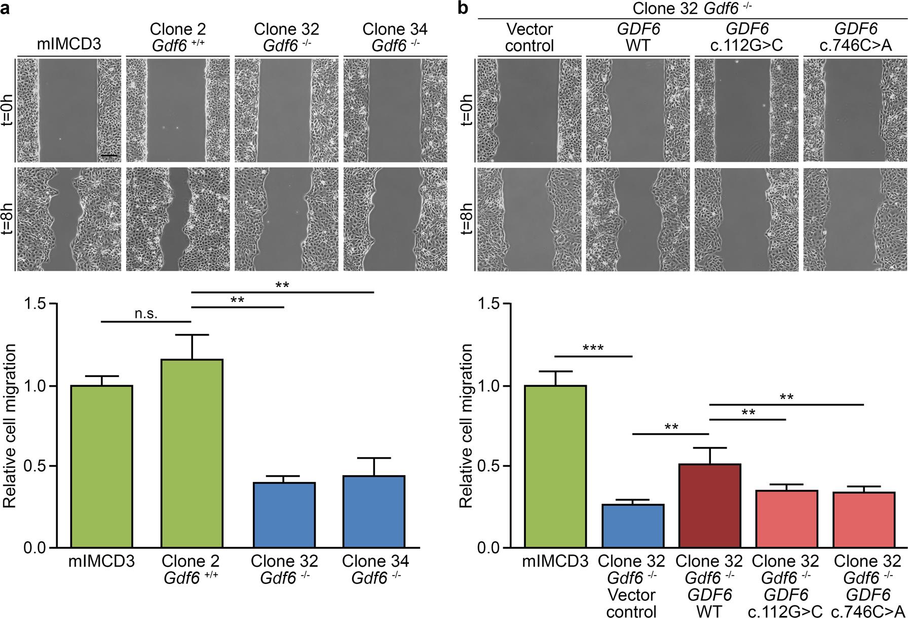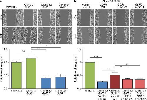 a Relative to mIMCD3 cells, migration of Gdf6â/â mIMCD3 cells (clones 32 and 34) was significantly decreased compared with Gdf6+/+ mIMCD3 cell clone 2. b The effect of Gdf6 knockout in mIMCD3 cell clone 32 expressing empty vector (vector control) relative to mIMCD3 cells was partially rescued by stable expression of human wild-type (WT) GDF6 in mIMCD3 cell clone 32. Conversely, relative cell migration of Gdf6â/â mIMCD3 cell clone 32 stably expressing GDF6 c.112G>C or c.746C>A variants was significantly reduced compared with Gdf6â/â mIMCD3 cell clone 32 stably expressing wild-type GDF6. All results are meanâ±âSD from three independent experiments. Scale bar: 150âµm. N.s. not significant; **pâ<â0.01; ***pâ<â0.001.