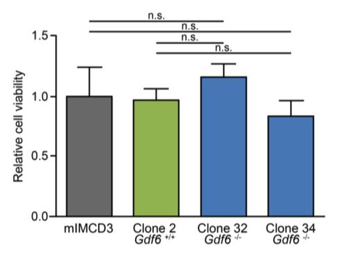 Supplementary Fig. 3 Cell viability measured by MTS assay 24 h after seeding was not significantly different when comparing mIMCD3 cells and Gdf6+/+ mIMCD3 cell clone 2 with Gdf6-/- mIMCD3 cell clones 32 or 34; results are mean ± SD from three independent experiments.