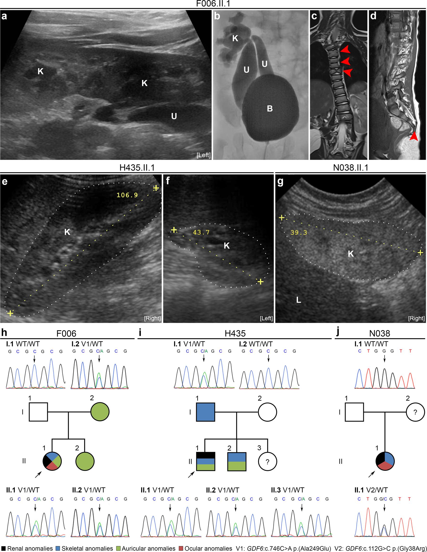 a Renal ultrasound of index patient F006.II.1 was notable for left-sided crossed fused kidney (K) ectopia with megaureters (U). b Voiding cystourethrography of patient F006.II.1 revealed grade-IV vesicoureteral reflux into two megaureters (U) with orthotopic ostia in the bladder (B) and connected to the superior or inferior dilated kidney (K) pelvis of the fused kidneys. c, d MRI of the spine of patient F006.II.1 showing malformations of cervical and thoracic vertebral bodies, e.g., fused and butterfly vertebrae (arrows) (c) and missing fifth sacral vertebral body and coccyx (arrow) (d). e, f Renal ultrasound of patient H435.II.1 at the age of 11 years was unremarkable on the right side (e), while the leftkidney was hypodysplastic (f) and nonfunctional on DMSA scan. g Renal ultrasound of patient N038.II.1 at age 6 months showing renal hypodysplasia, as indicated by reduced size, hyperechogenicity, and reduced corticomedullary differentiation of the rightkidney depicted. The leftkidney was also hypodysplastic (not shown), and the patient required kidney transplantation at 5 years of age. hâj Pedigrees of families F006 (h), H435 (i), and N038 (j) with colored shading indicating phenotypical overlap with respect to renal, skeletal, auricular, and ocular anomalies in individuals with rare GDF6 variants. The GDF6 mutational status (V1: c.746C>A p.(Ala249Glu), V2: c.112G>C p.(Gly38Arg), WT: wild-type) is indicated, and corresponding electropherograms are shown for all analyzed family members (no DNA sample was available from individual N038.I.2). Clinical and radiological information was not available from individuals H435.II.3 (1 year of age) or N038.I.2. L, liver; the kidneys are marked by dotted lines (eâg).